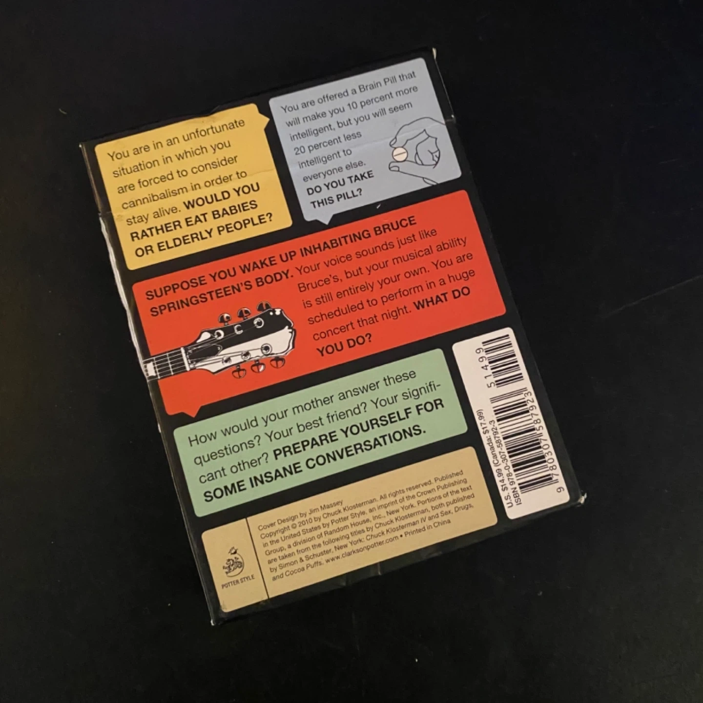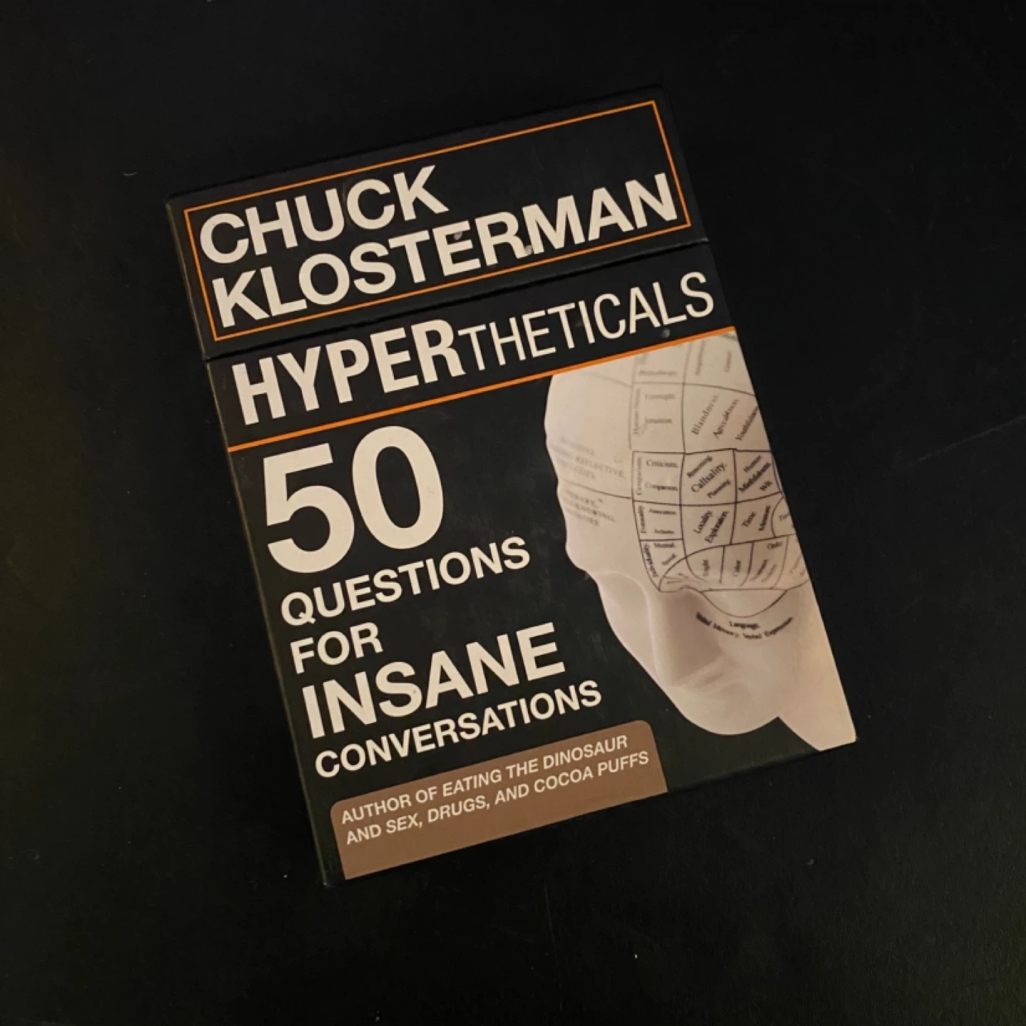 Selling Chuck Klosterman's "Hypertheticals: 50 Questions for Insane Conversations"! It's a thought-provoking card game perfect for sparking some truly wild discussions with friends. Get ready to dive into some seriously bizarre scenarios and see where the conversation takes you!