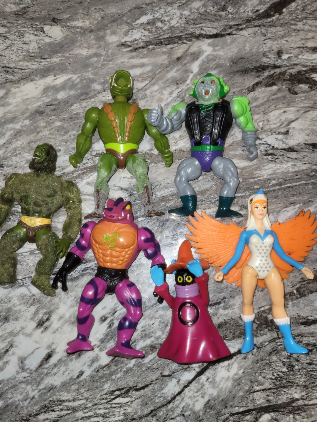 Collection of six vintage Masters of the Universe action figures. Figures include Beast Man, Mer-Man, Trap Jaw, and more. Great for collectors.