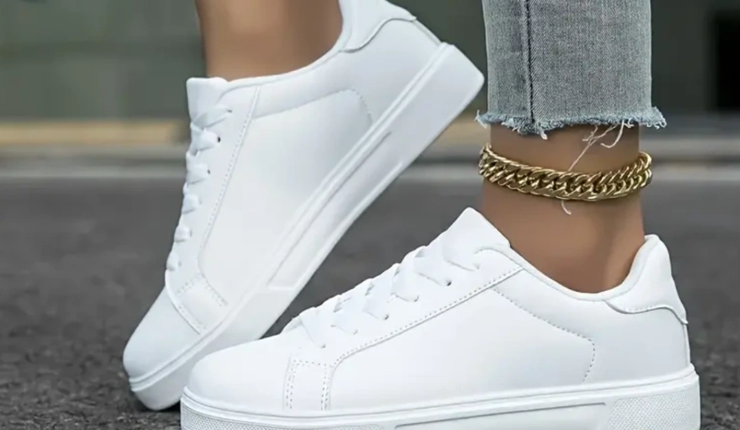 Pair of women's white sneakers. Lace-up closure. Platform sole. Casual style. Comfortable wear.