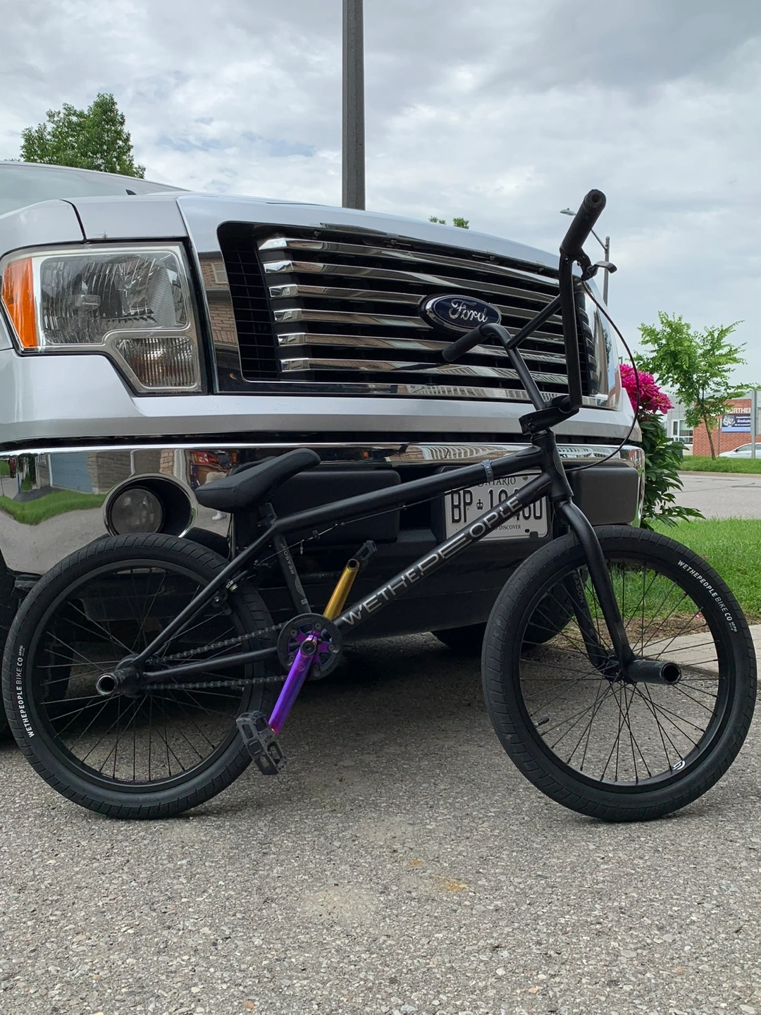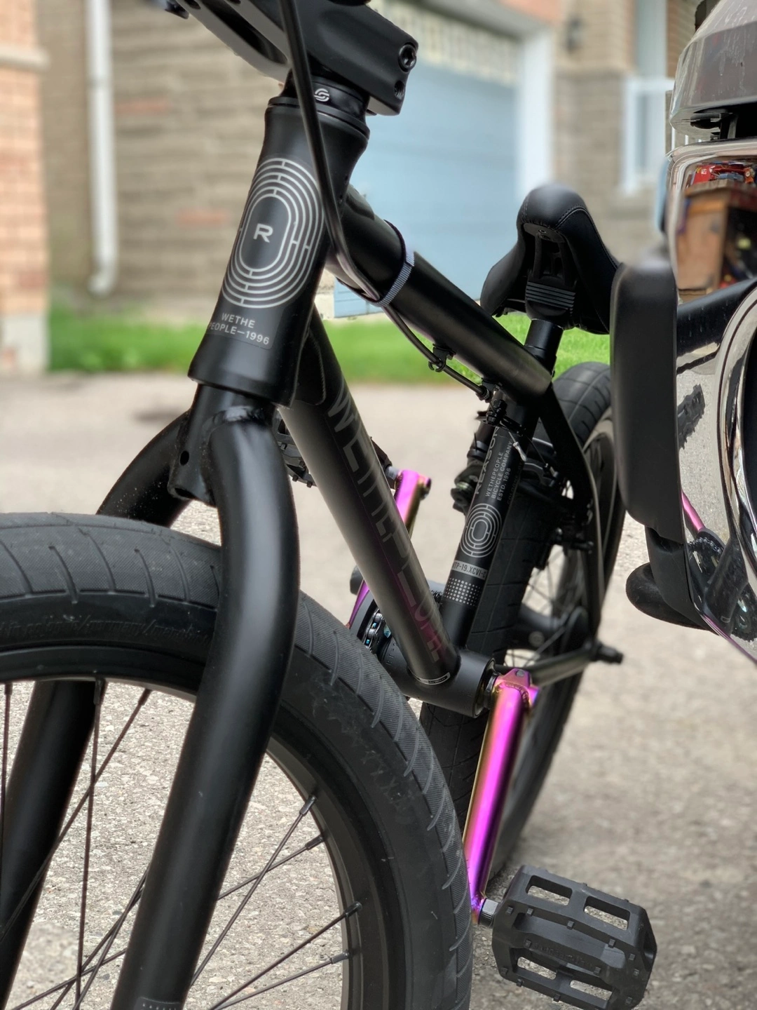 Black BMX bike. We The People brand. Reason model. Features purple and iridescent accents. Good condition