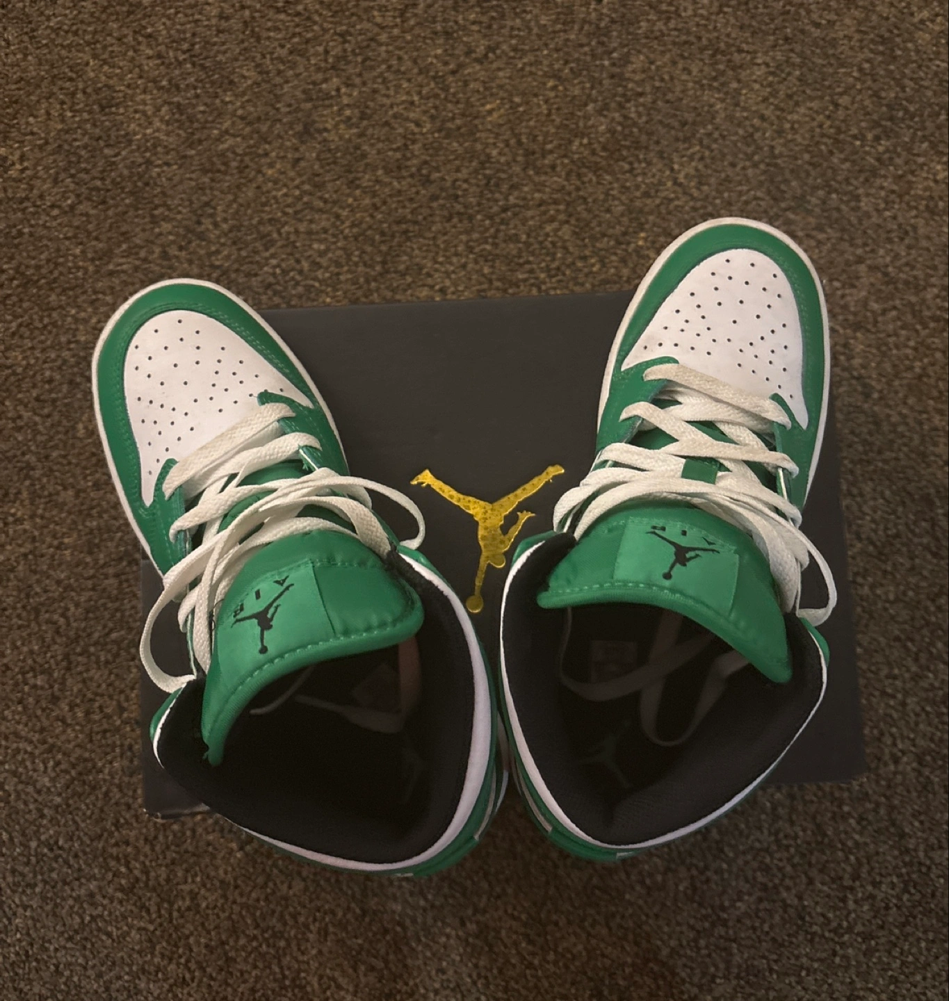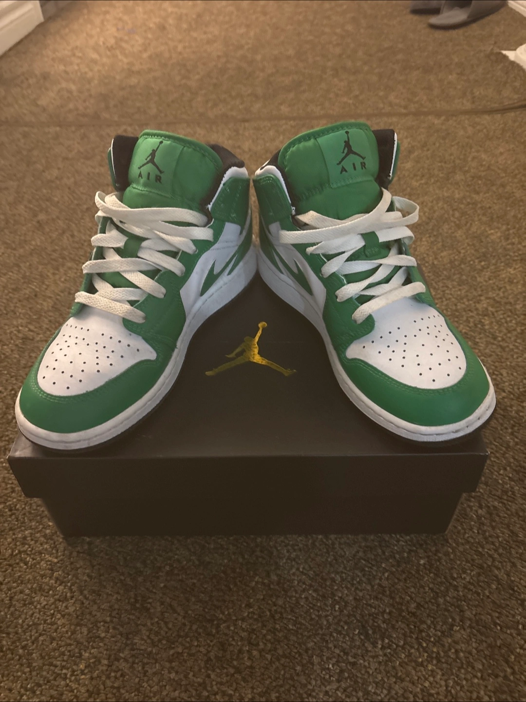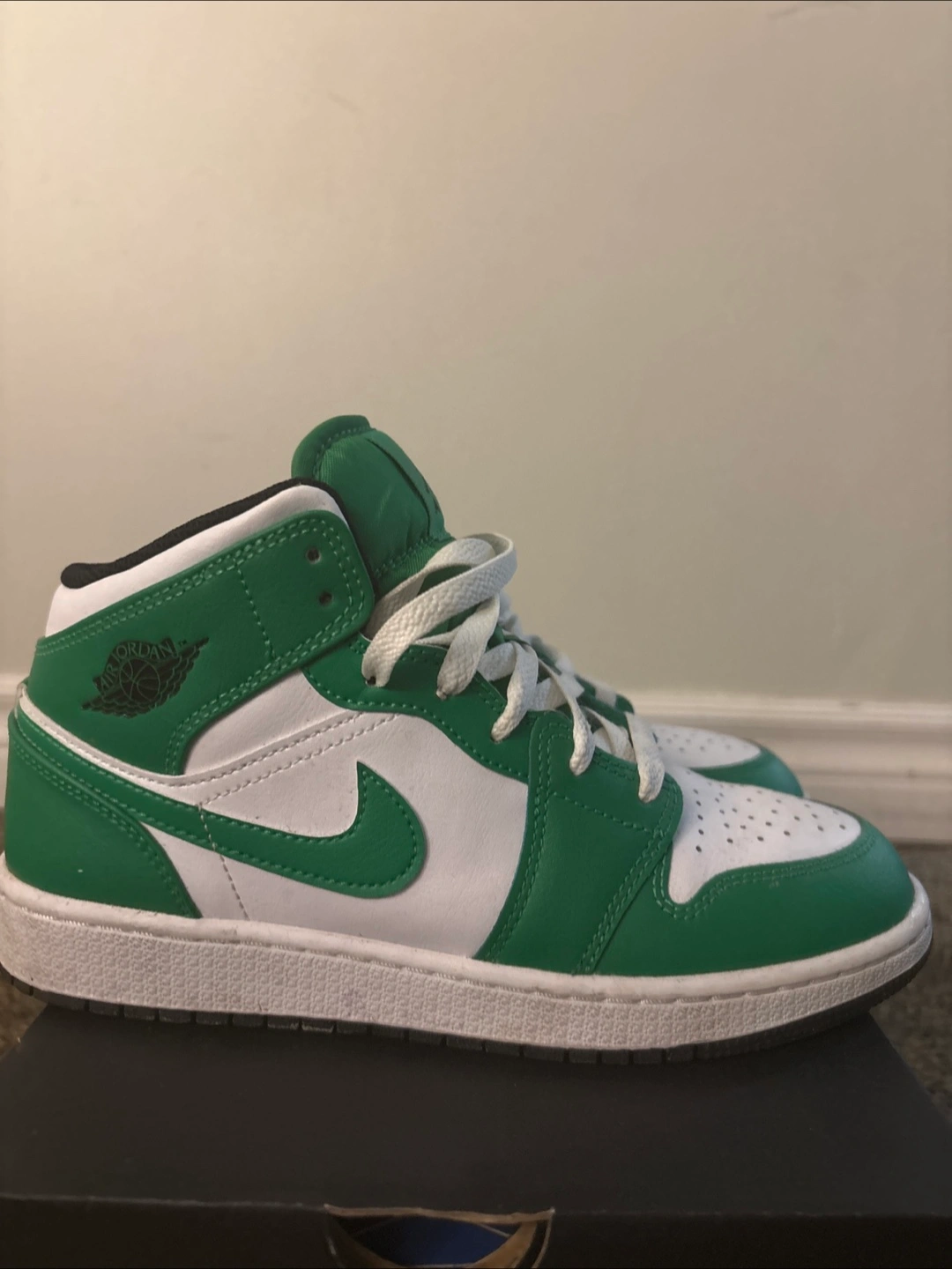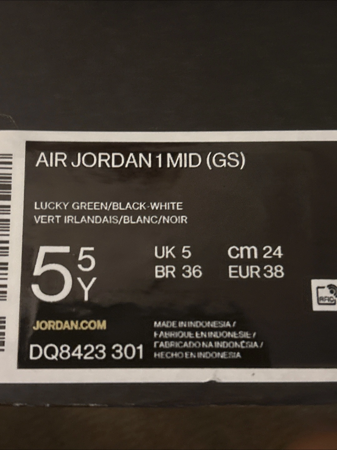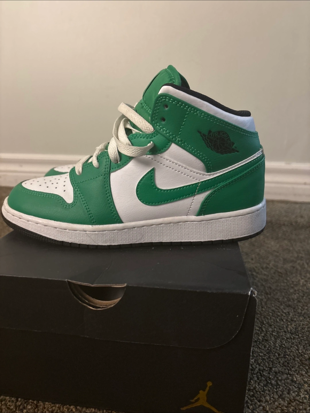 Boys' Air Jordan 1 Mid sneakers. Colour: Lucky Green/Black-White. Size 5Y (UK 5, EUR 38, CM 24, BR 36). Like New, in original box.