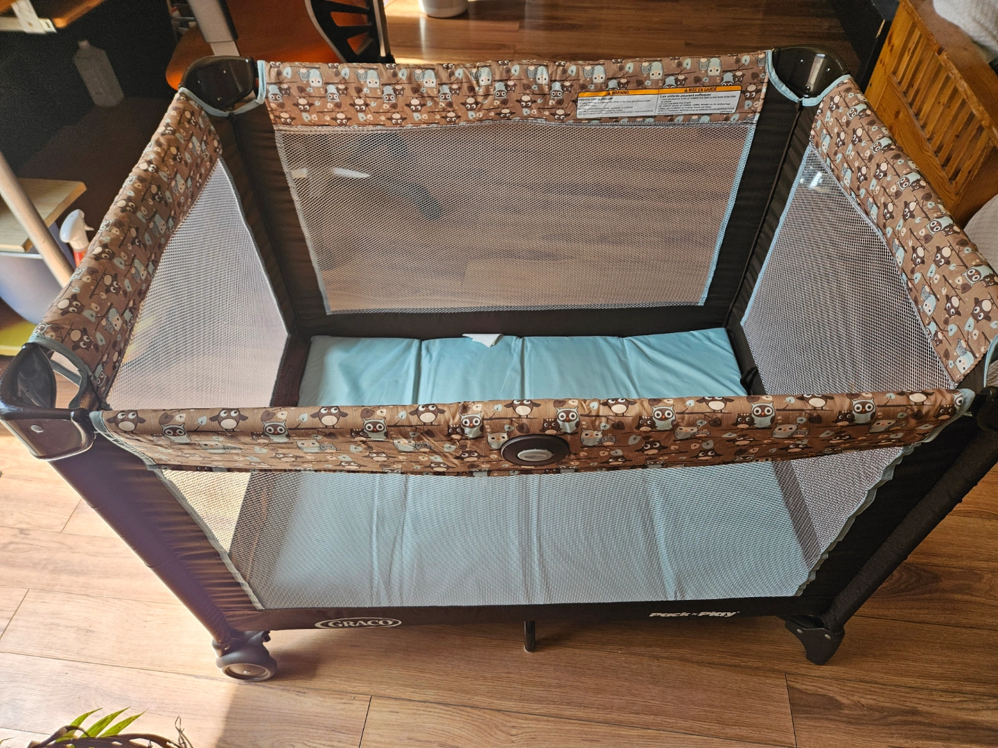 Portable playard, easy to fold and store. Features mesh sides for ventilation. Cute owl print. Includes a padded mat.