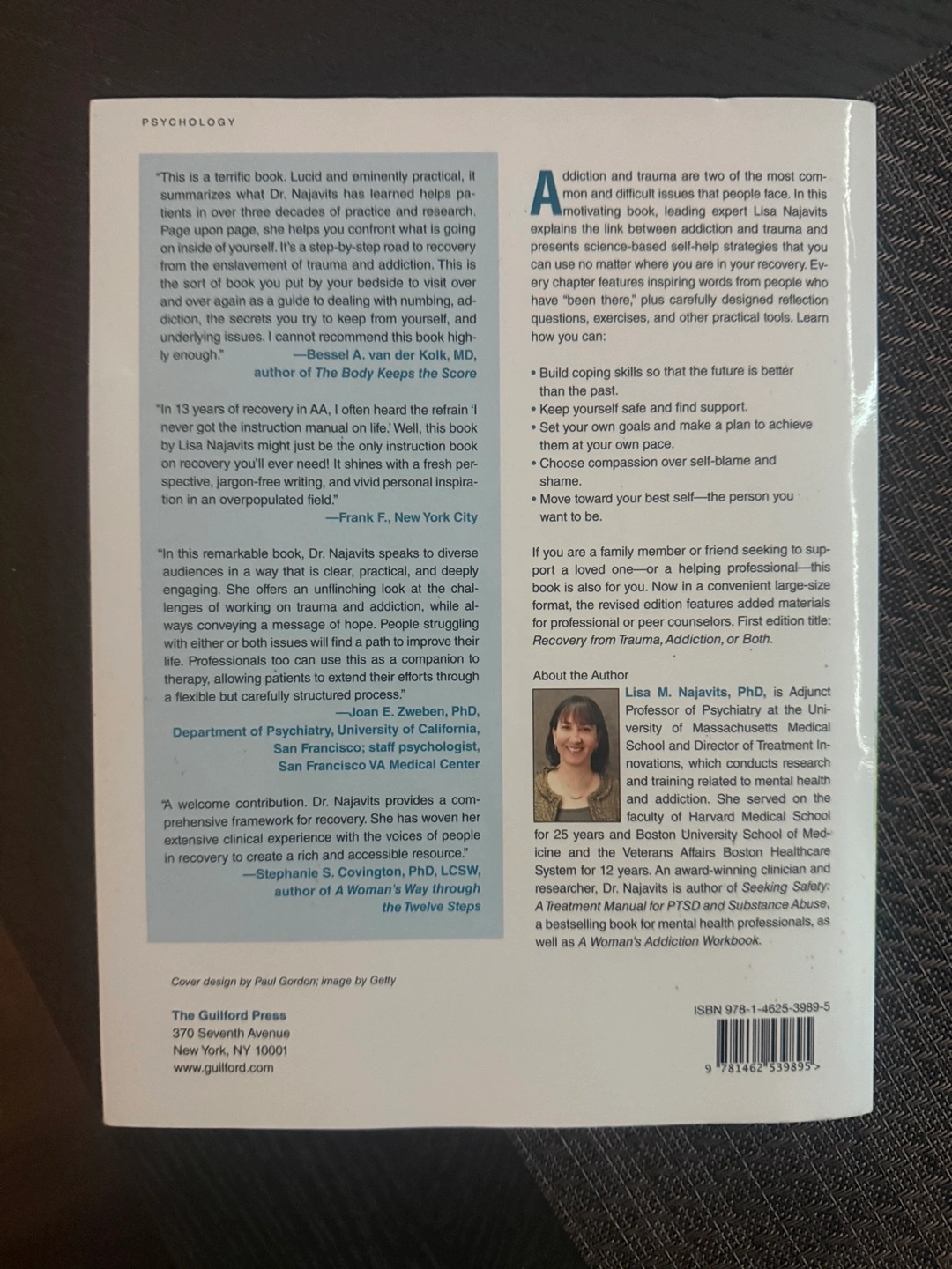 Revised edition book. Recovery from addiction, trauma, or both. Author is Lisa M. Najavits, PhD. Includes helpful strategies. Paperback. This book is an amazing read! I would recommend this to people who are finding their best self after an incident!