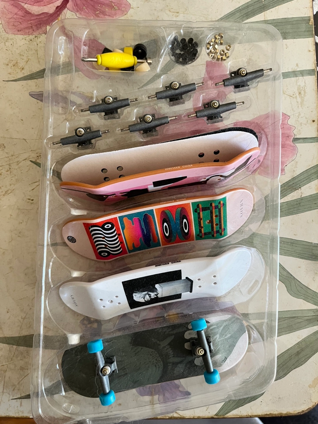 Four fingerboards, trucks, wheels, and hardware. Great for collectors or beginners.