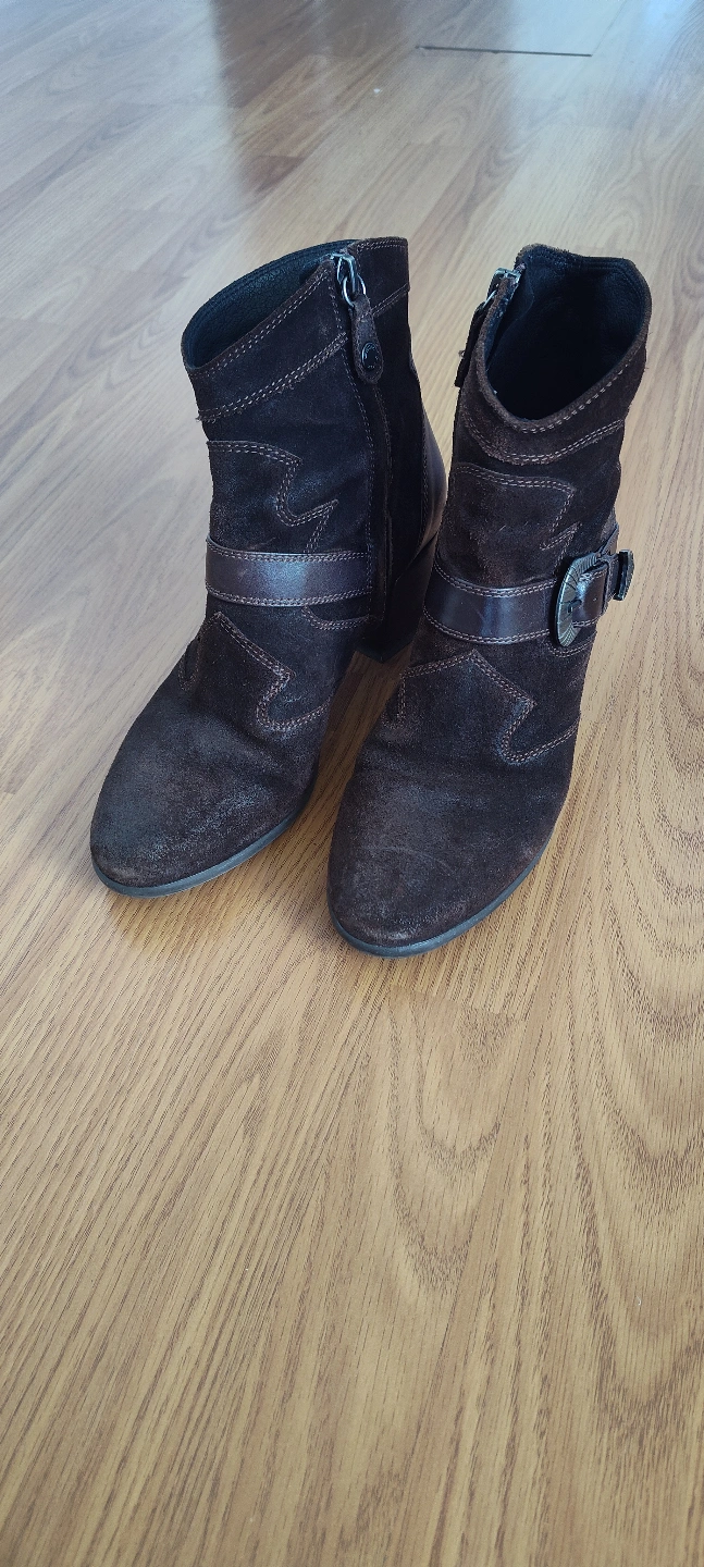Women's brown suede ankle boots. Genuine leather. Features a buckle accent and side zipper. Low block heel. Check out my other listing. There may be something else you're also interested.