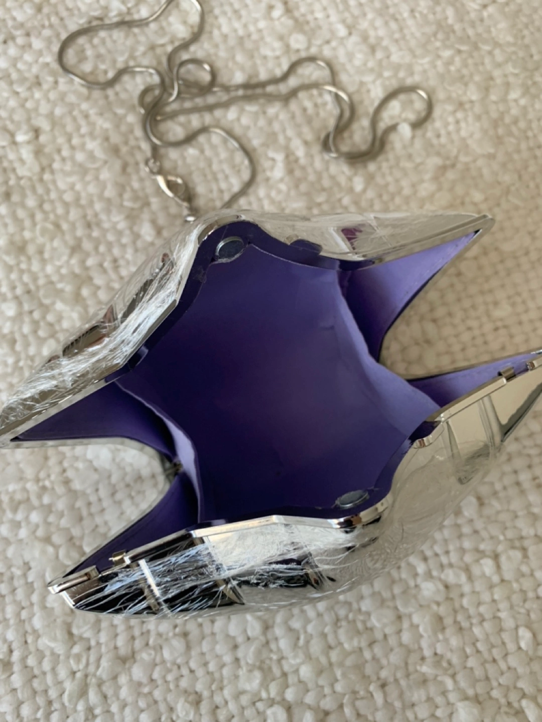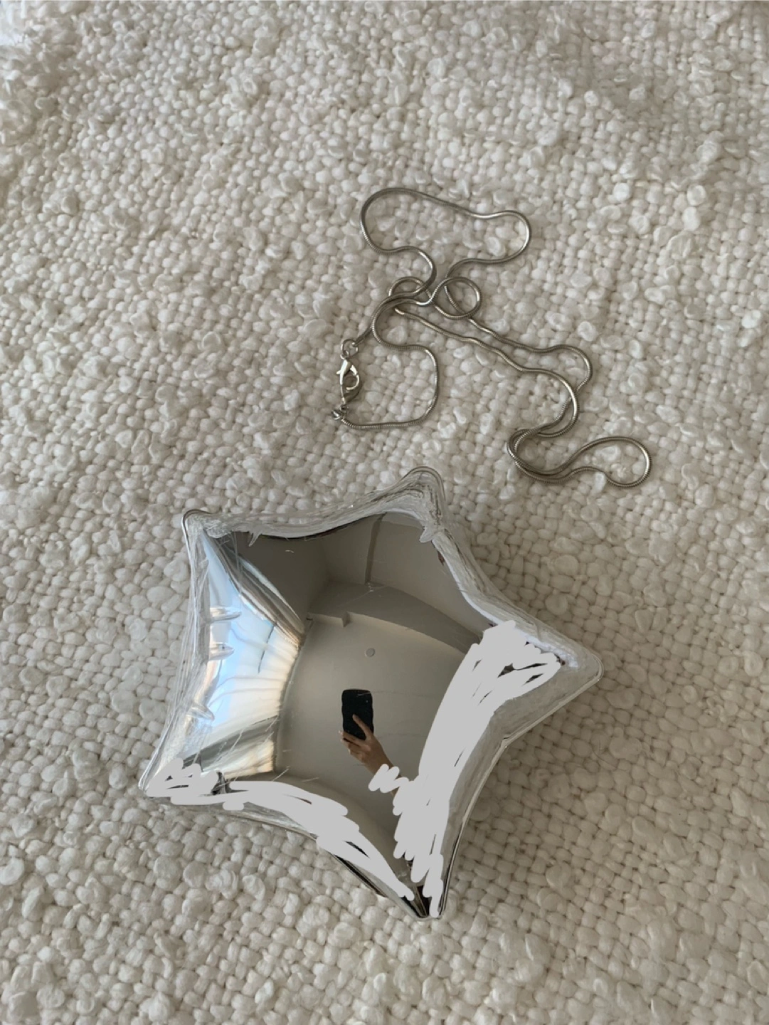 Silver metallic star-shaped clutch. Viral Zara dupe. Features a removable chain strap. Has lining inside. Bought for a wedding, never ended up using it. Originally bought for $30+ tax Brand new, still has the plastic peel cover to keep it scratch free. Just blotted out my reflection in the photo. Pick up near Spadina Ave & Front St W Cash only please!