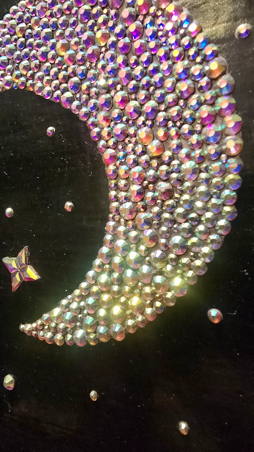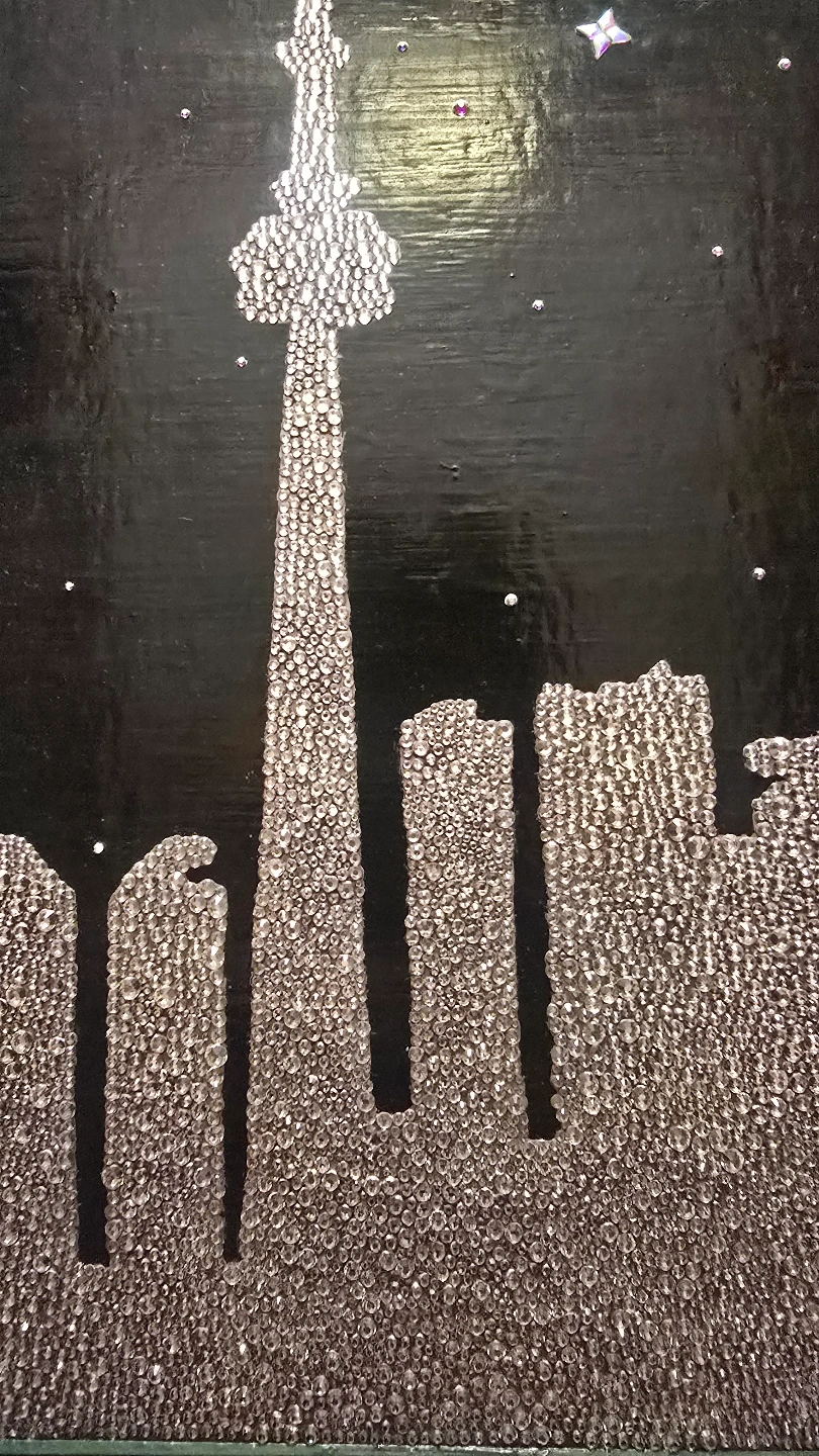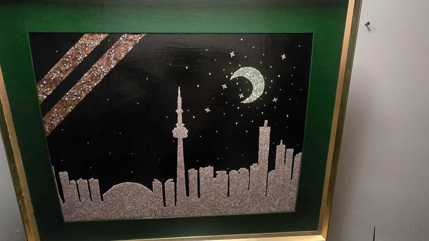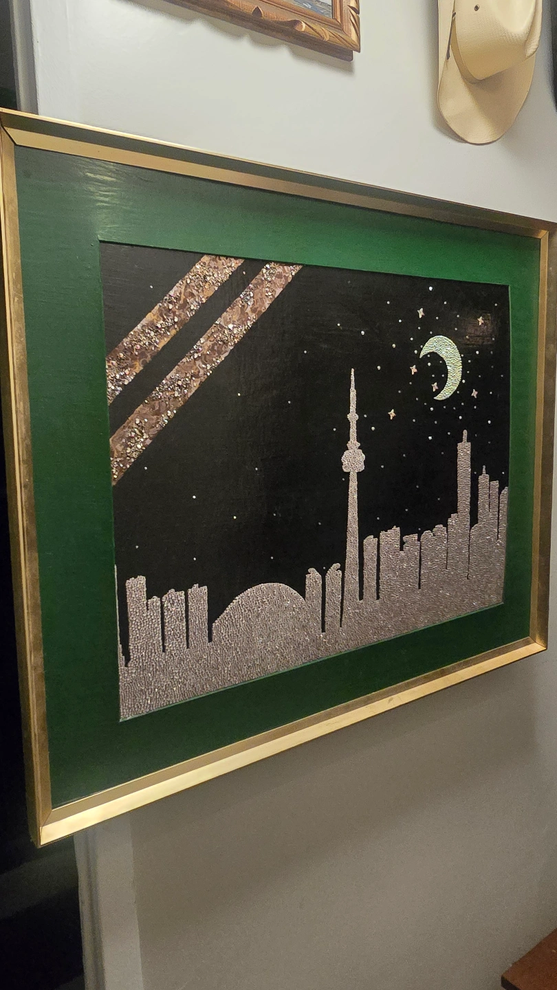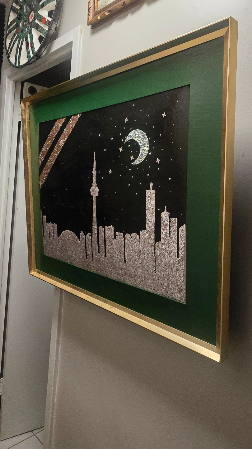 Stunning rhinestone artwork depicting the Toronto skyline at night. Features the CN Tower, crescent moon, and stars. Gold and green frame. Unique and eye-catching piece. Handmade. Cash only, pick up only at The Juntion, near StockYards.
