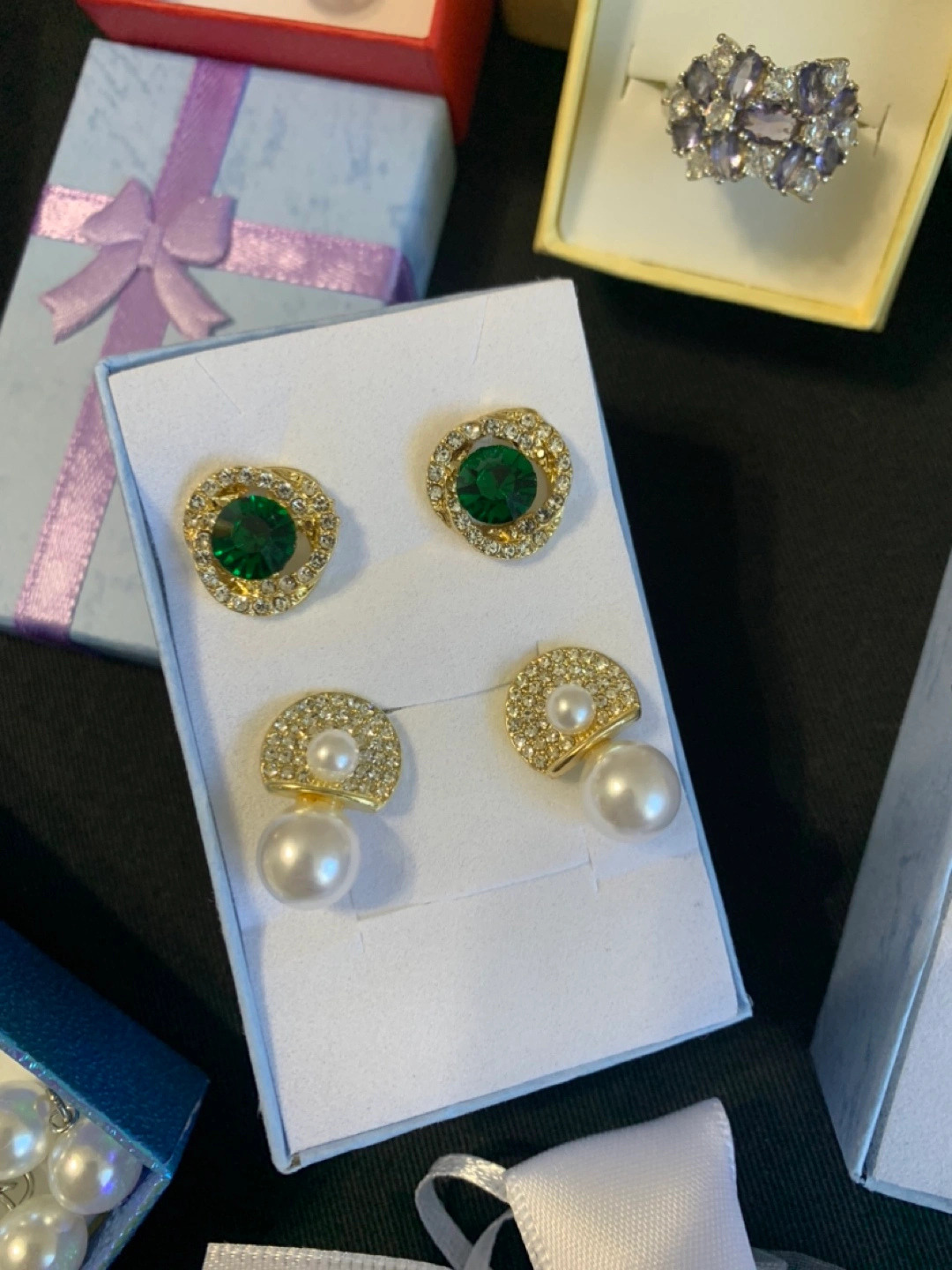 Set of two pairs of earrings. One pair features green stones, the other pair features pearls. Gold tone metal. Perfect for gift
