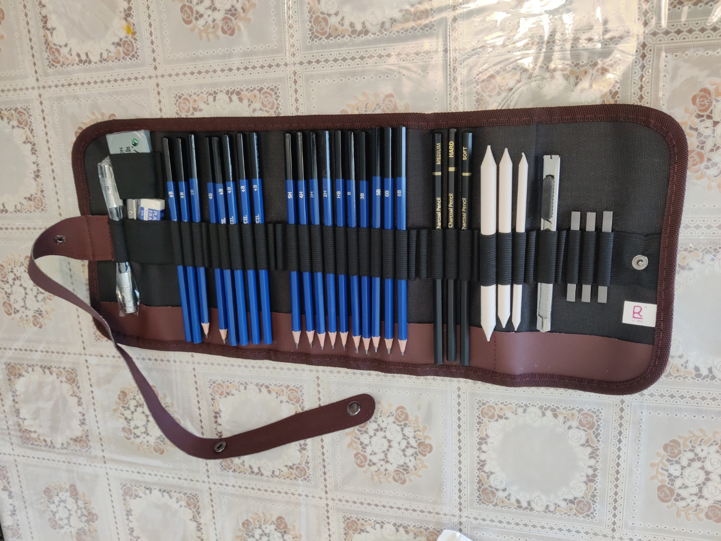 Professional art supplies kit. Includes graphite pencils, charcoal pencils and graphite sticks, eraser and kneaded eraser, pencil extender, pencil sharpener and cutter, stump blender and carrying case & belt. Great for students and artists. From a no pet non smoking home Meetup near Finch and Yonge Cash only Please check other listings on my profile :)