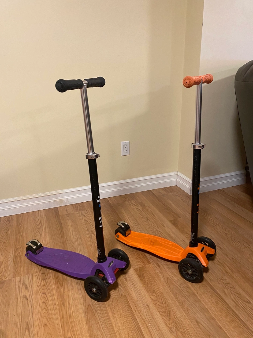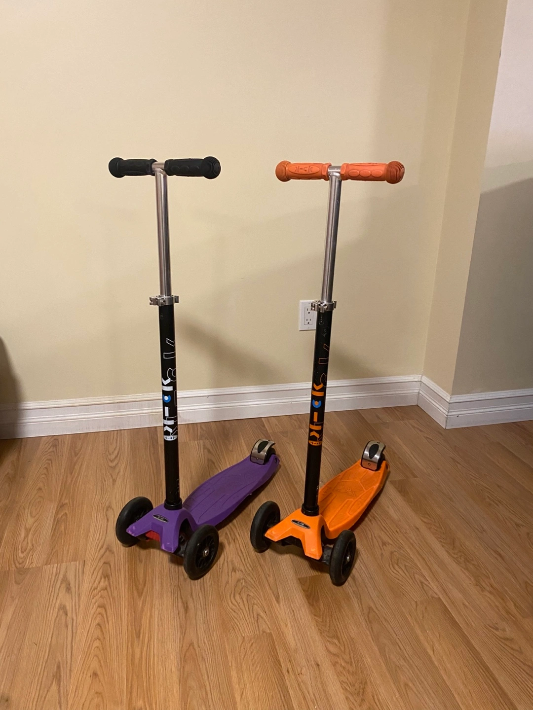 Pair of used Micro Kickboard scooters. One purple, one orange. Good condition. Great for kids.