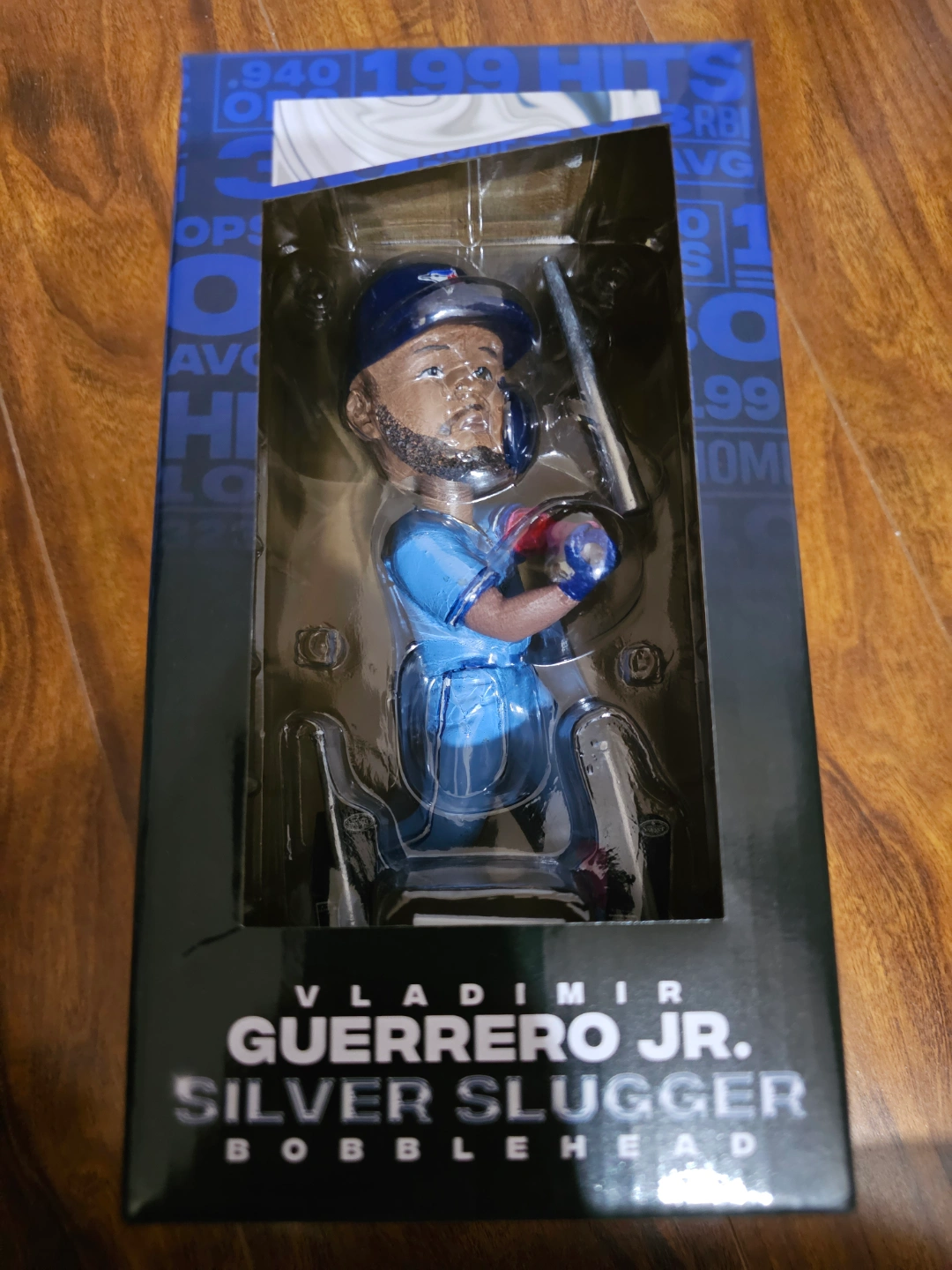 New in box. Vladimir Guerrero Jr. Toronto Blue Jays Silver Slugger bobblehead. Collectible item.