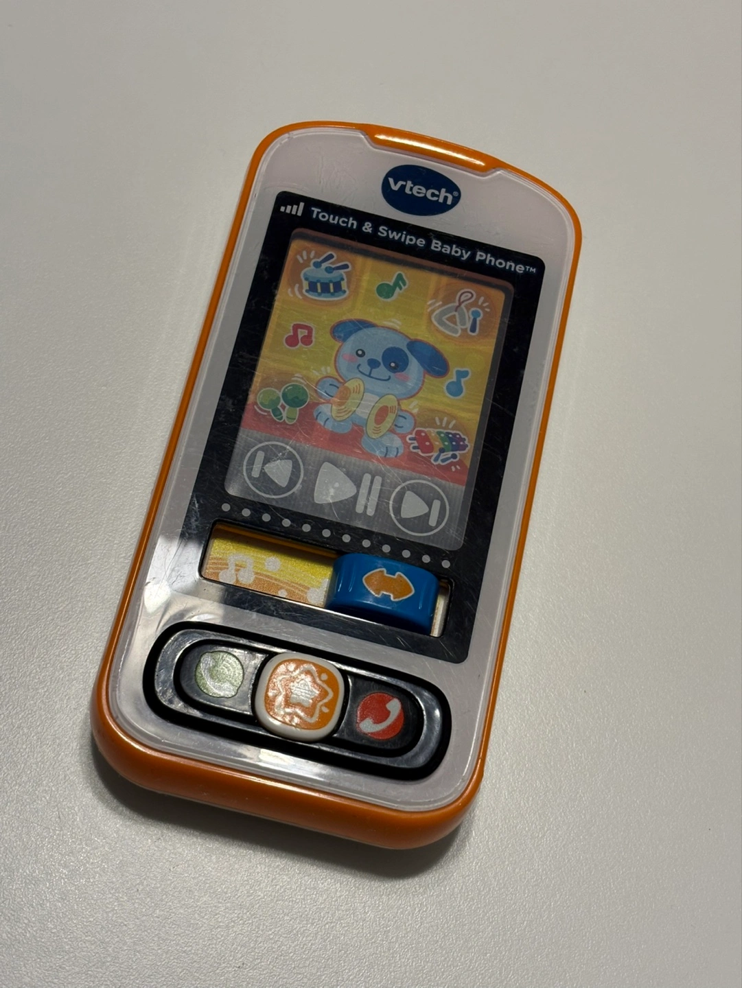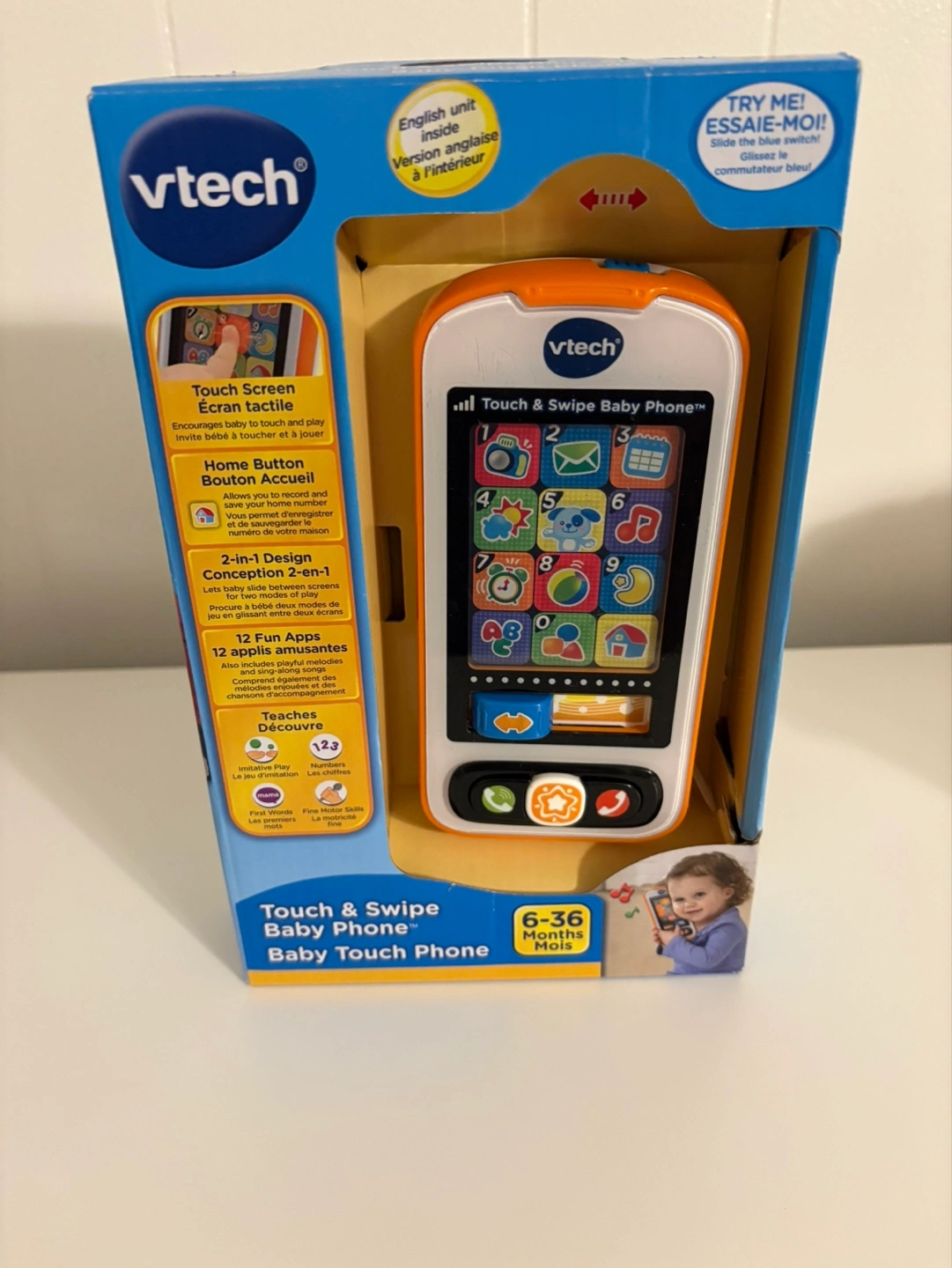 Vtech touch and swipe baby phone. 6-36 months. -Home button - Language skills development -music apps -music apps -Daily life concepts -call friends. Great for keeping kiddos busy in the car, stroller or while shopping.