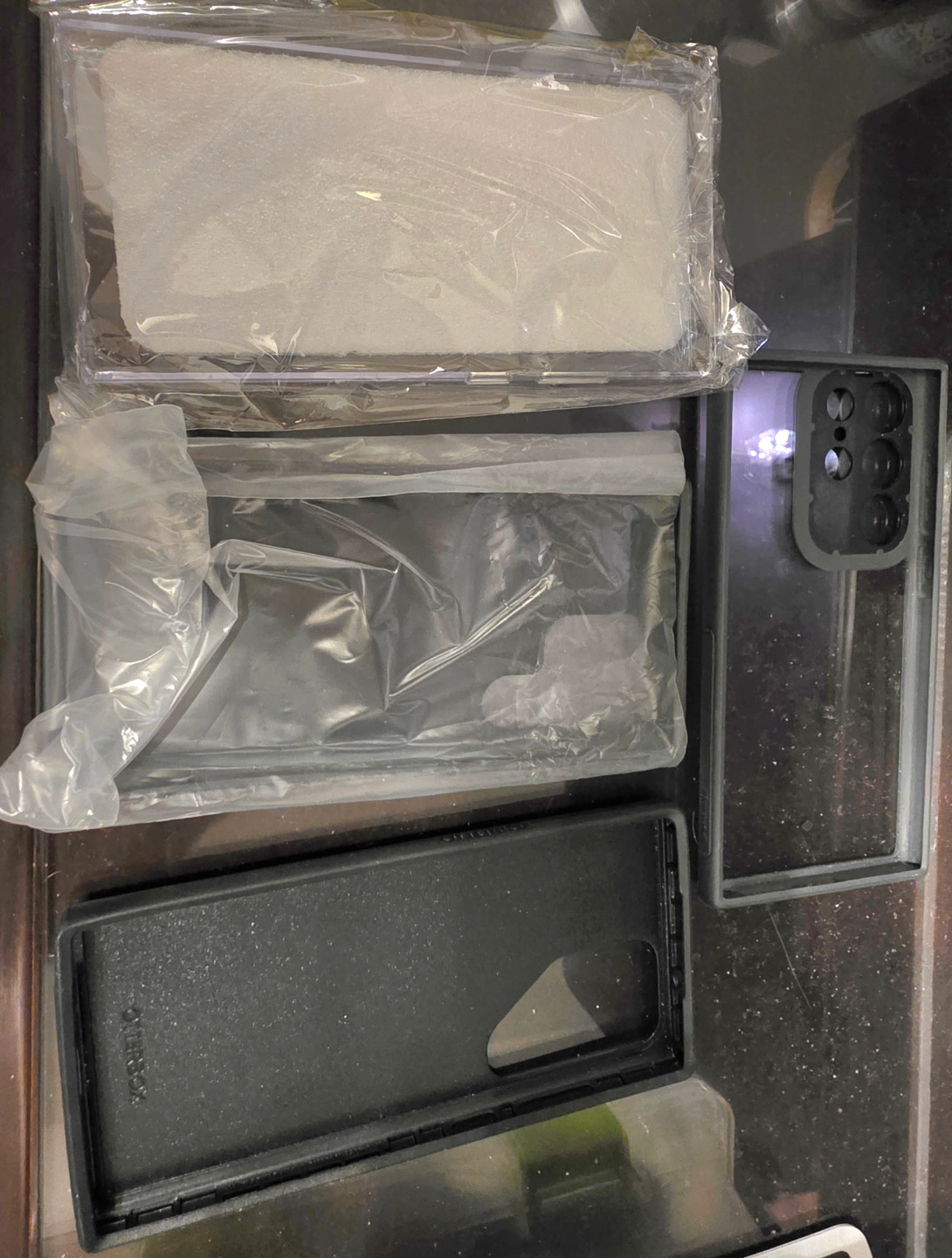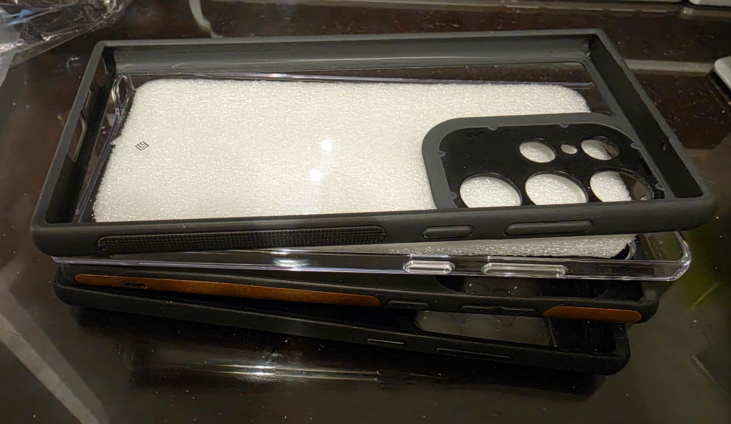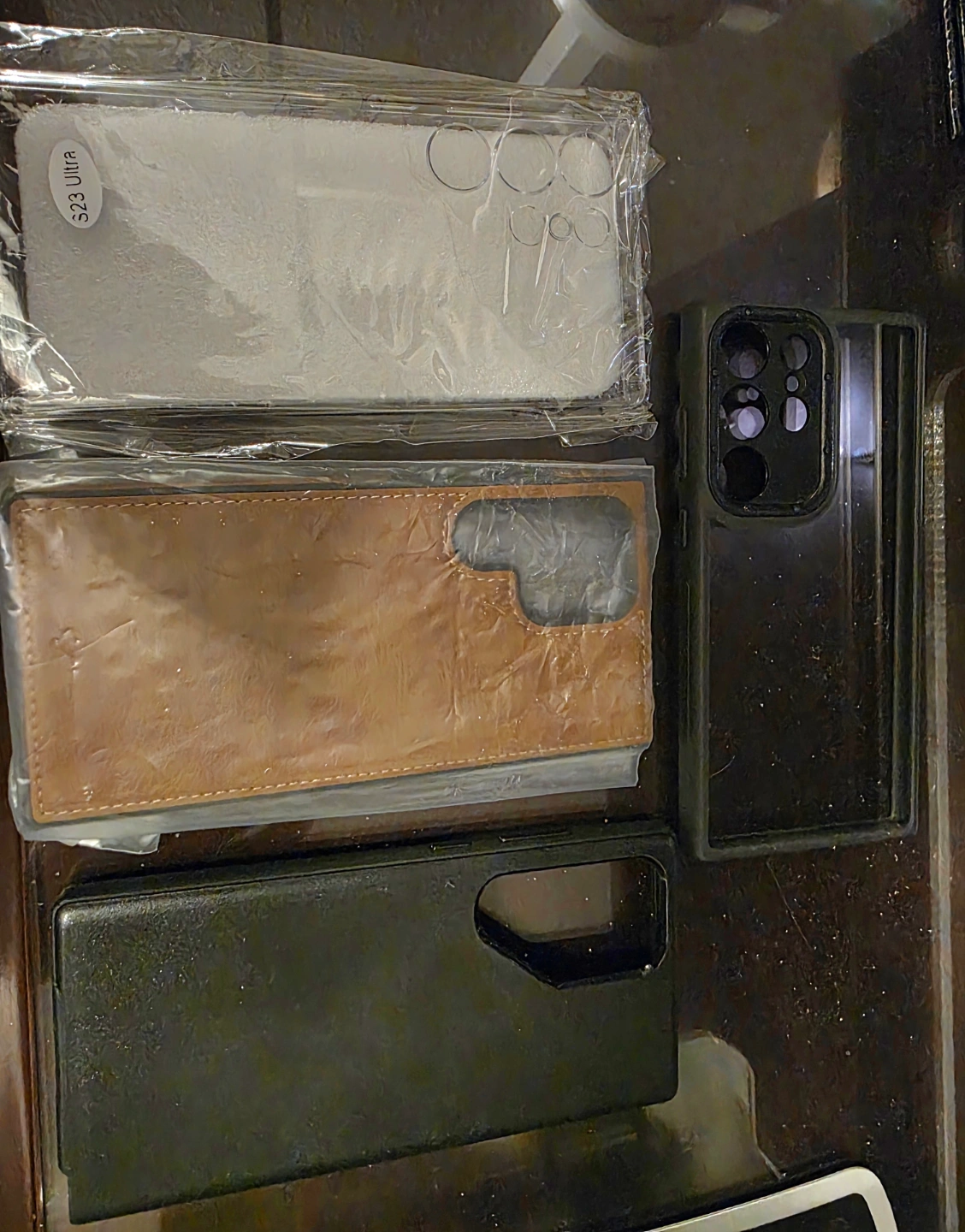 Four phone cases for the Samsung Galaxy S23 Ultra. Includes clear case, stylish black case, classy brown leather case, and a black Otterbox slim style rugged case. Used a few times, but in like new condition. Sold as a bundle.