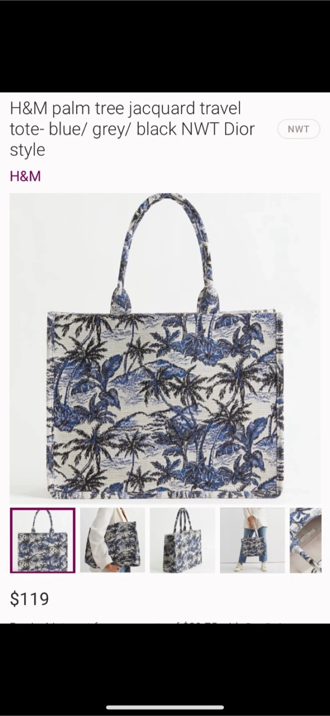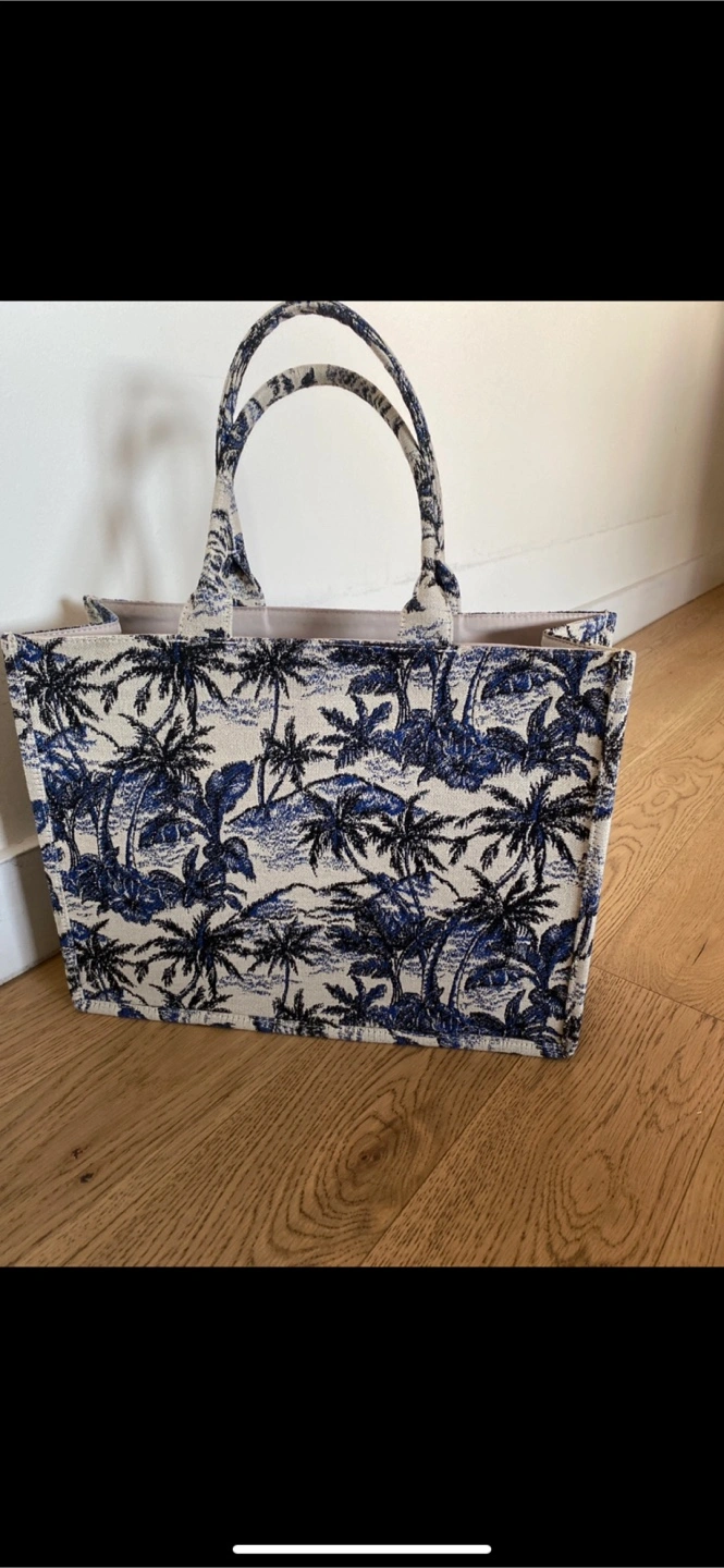 New with tags. H&M tote bag. Palm tree jacquard print. Blue, grey, and black colours. Dior-inspired style. Great for travel.