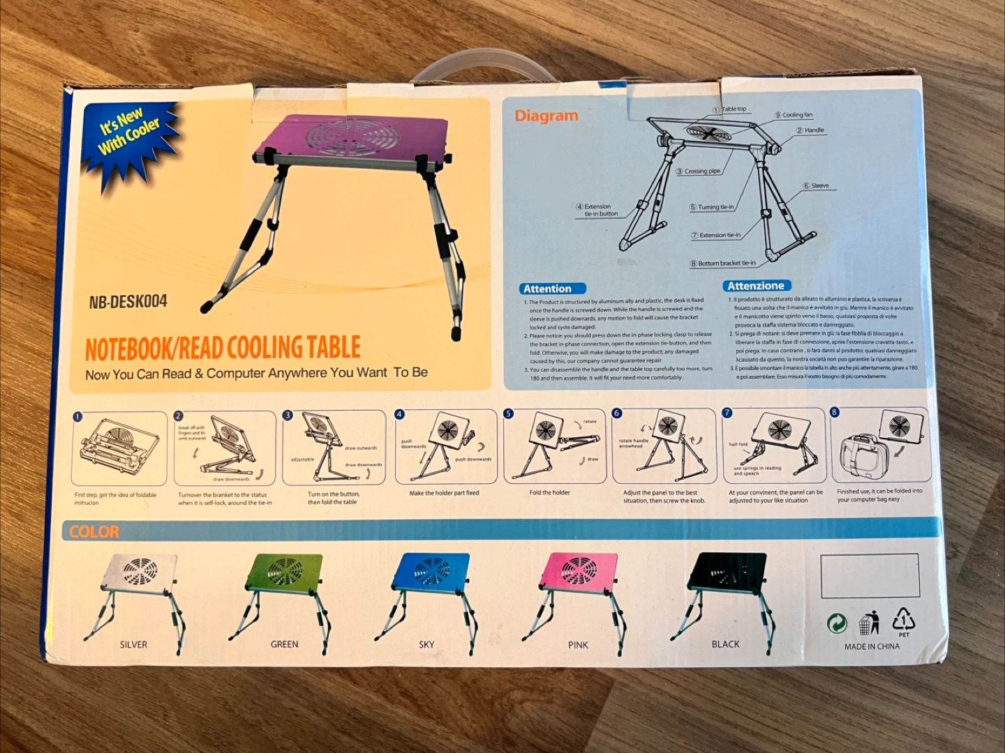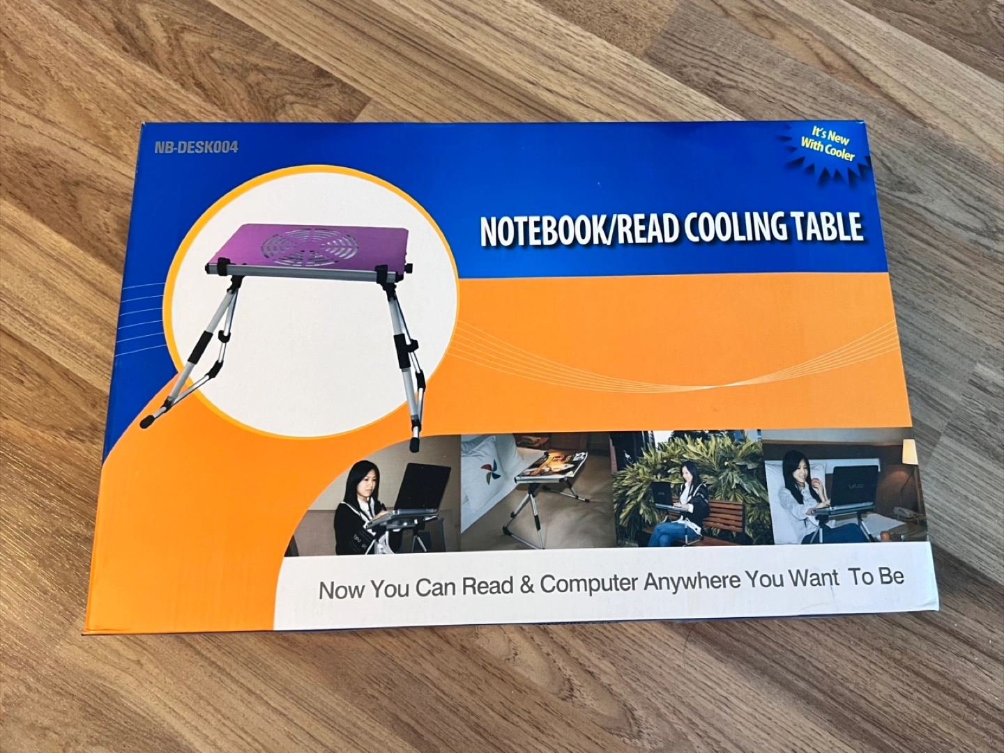 Adjustable laptop table with built-in cooling fan. Foldable design for easy portability. Great for use on the couch or bed. Colour: Purple.