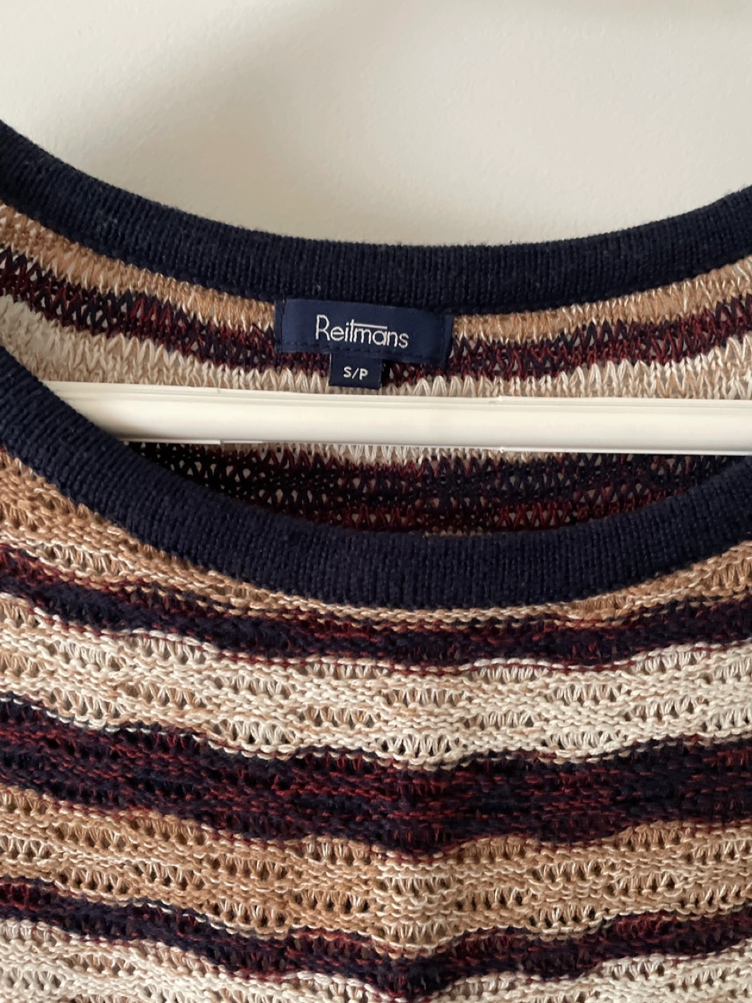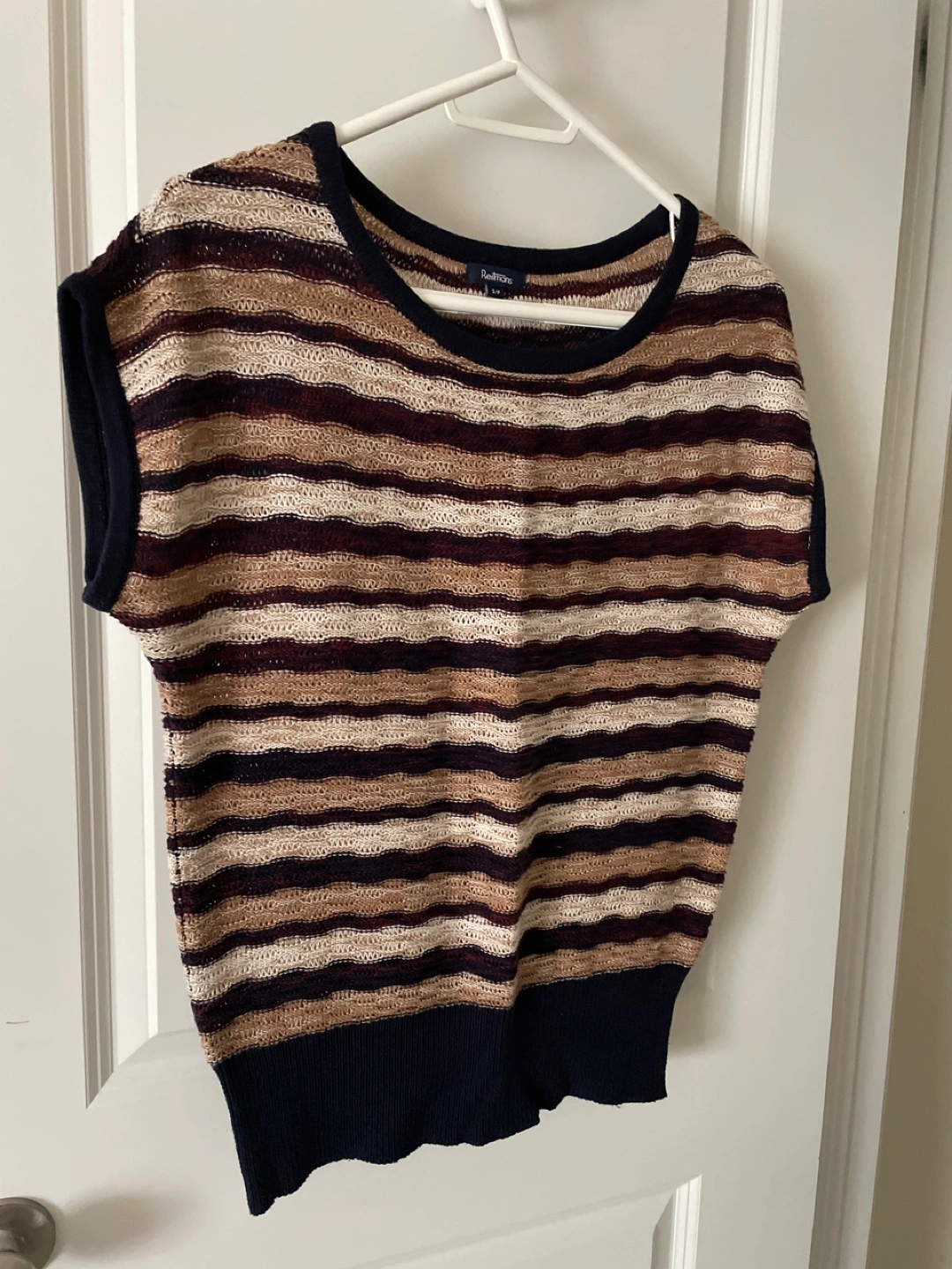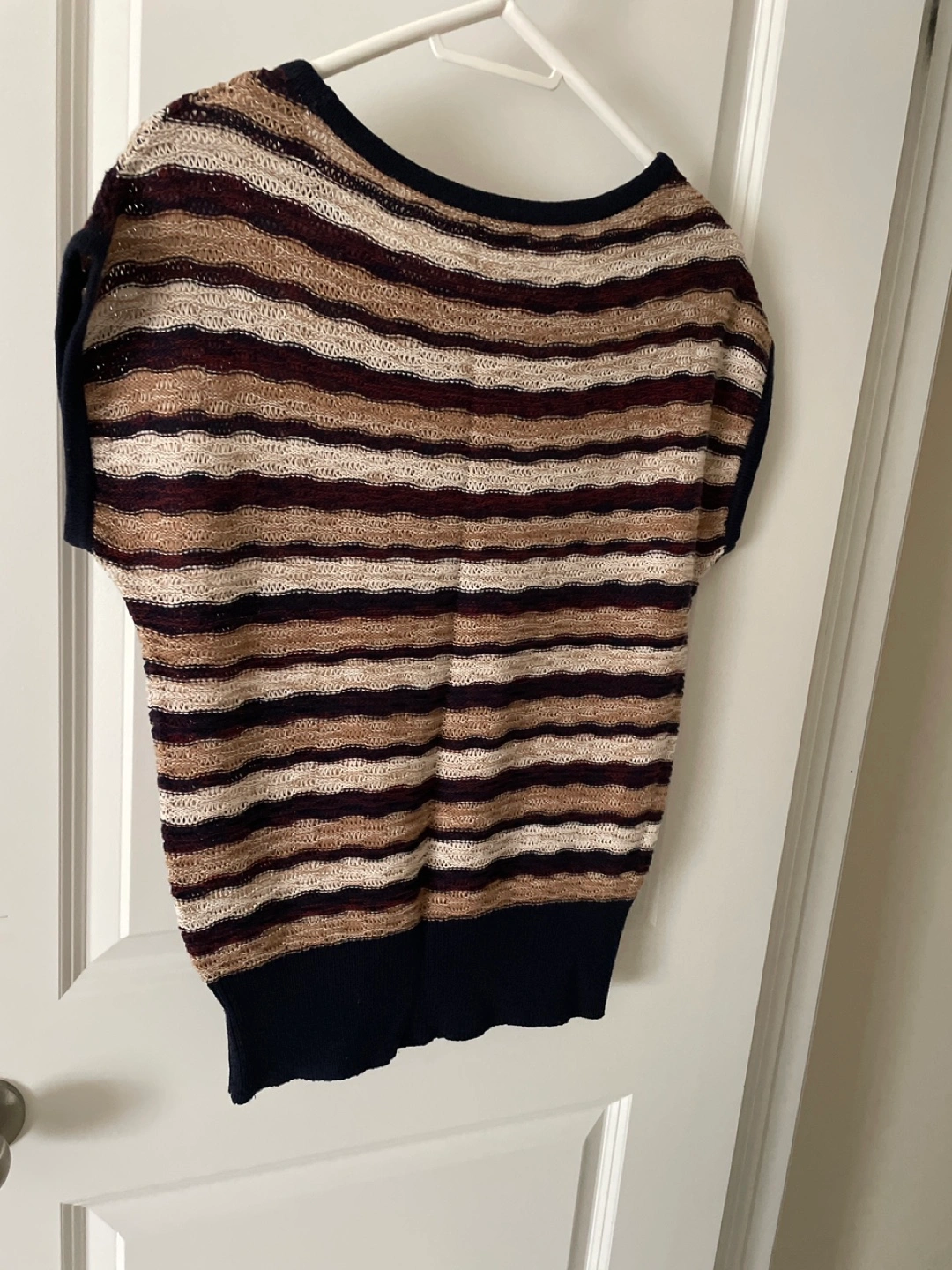 Short-sleeved, horizontally striped knit top. Brown, beige, and navy blue colours. Slight stretch. Relaxed fit. Fit medium sized too. Smoke free and pet free home