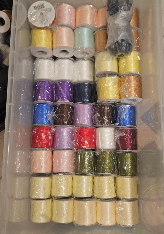 Many spools of ribbon in various colours and shades. Perfect for crafting projects. Sold as a job lot. approximately 100 rolls