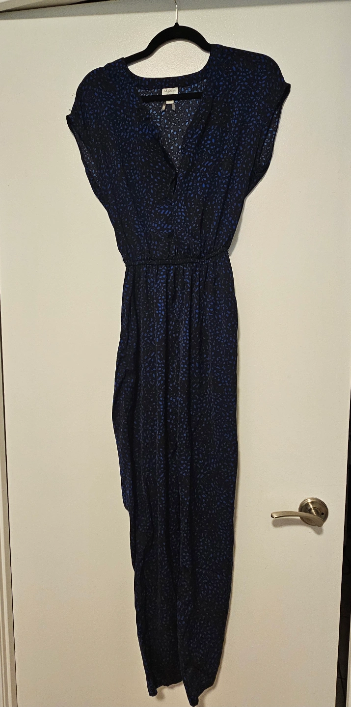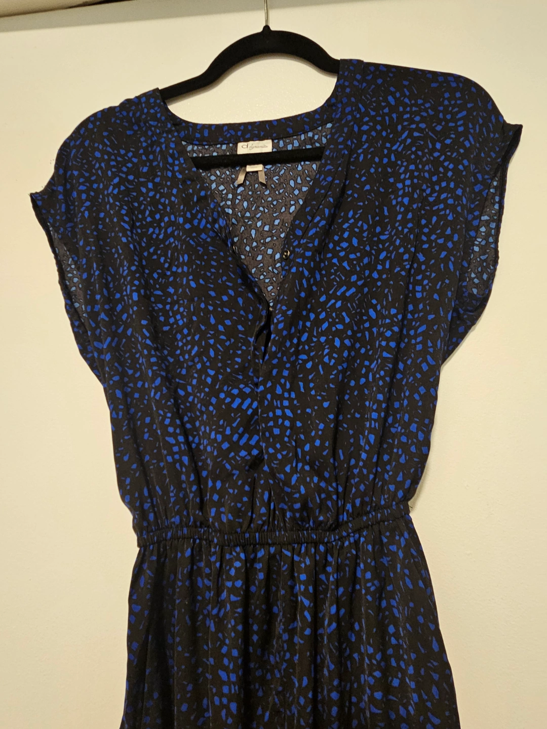 Beautiful blue and black patterned midi dress. Short sleeves, v-neck. Elasticized waist. Button-up front. Casual, comfortable, and stylish. Fits both xs and small. Pickup downtown Toronto
