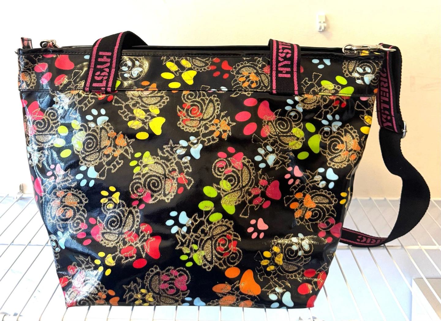 Black tote bag. Features colourful paw prints and swirls. Shiny, possibly coated fabric. Adjustable shoulder strap. Pink and black Hypnotic branded straps.