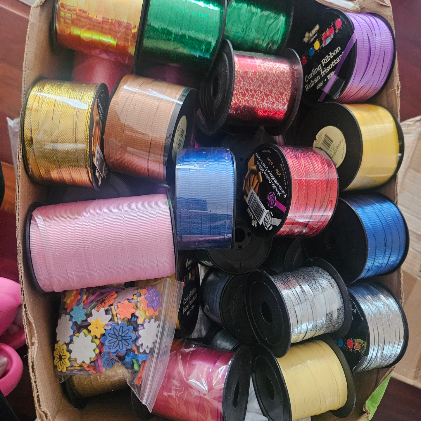 Assortment of curling ribbons in various colours and patterns. Includes a bag of assorted foam flowers and stars. Great for crafting and decorating.