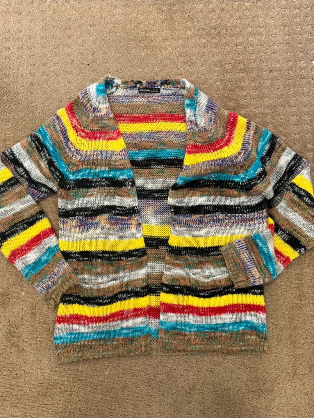 Women's colourful striped cardigan. Open front. Long sleeves. Knit material. Patch pockets.