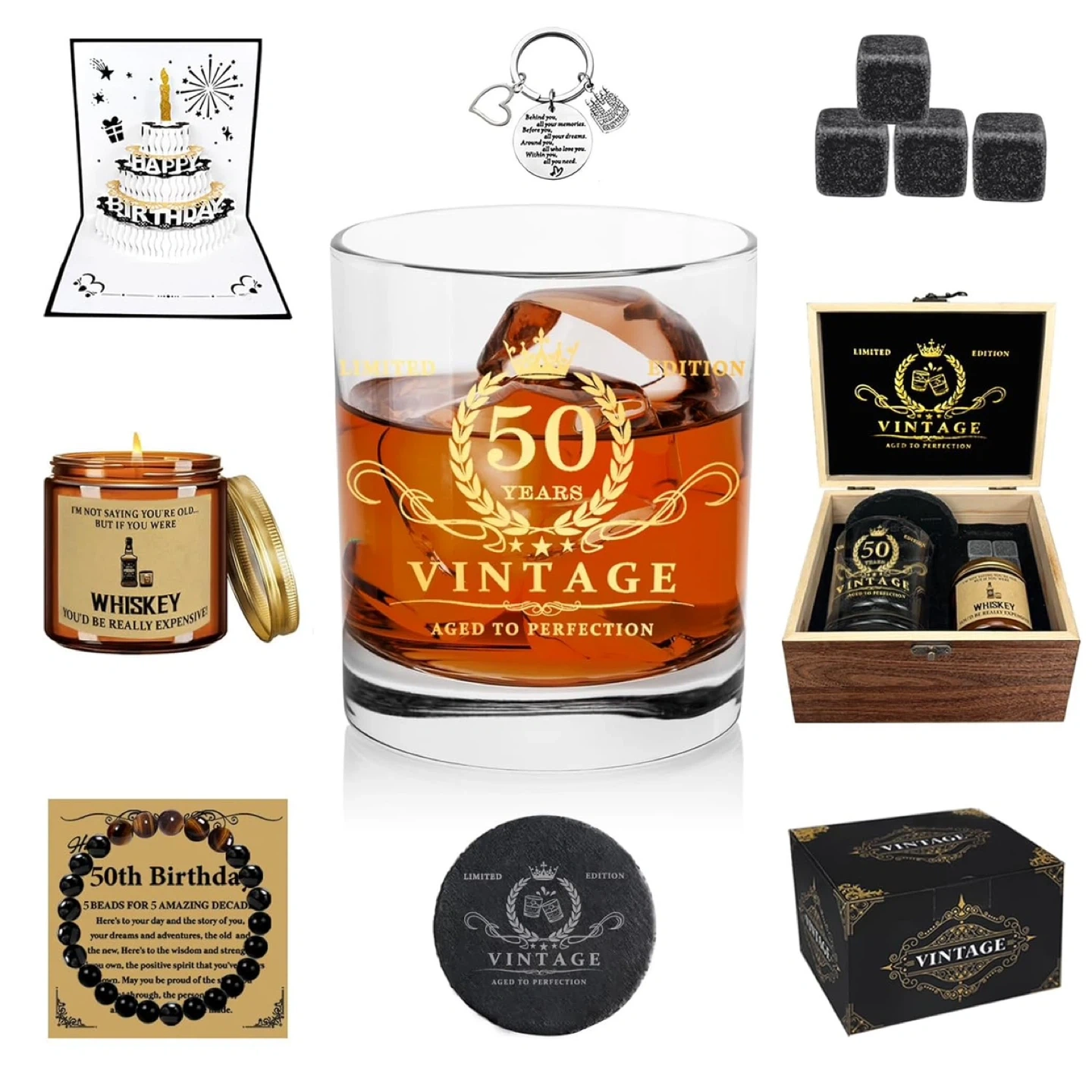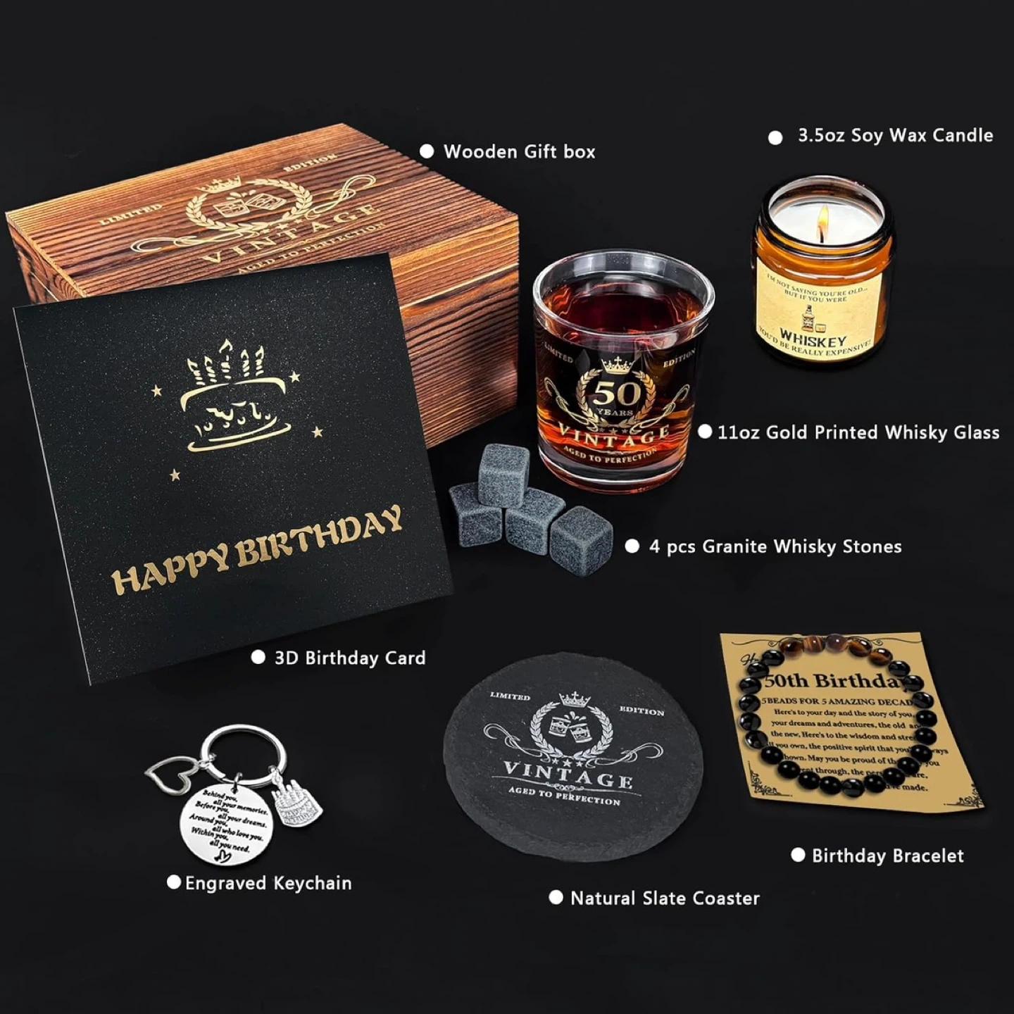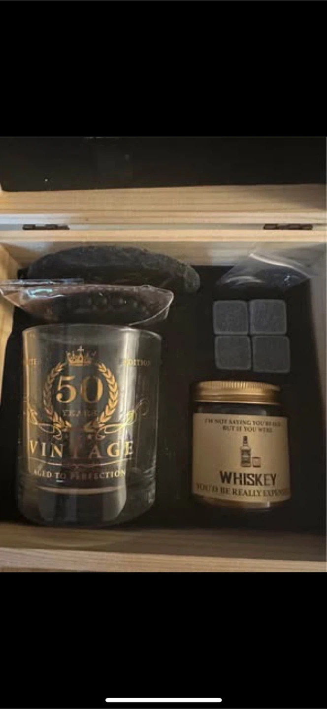This New 50th Birthday whisky gift set comes in a lovely wooden box, perfect for a gift! The set includes a glass, whisky stones, and other accessories to enhance their whisky drinking experience. Pick up Windsor Park.