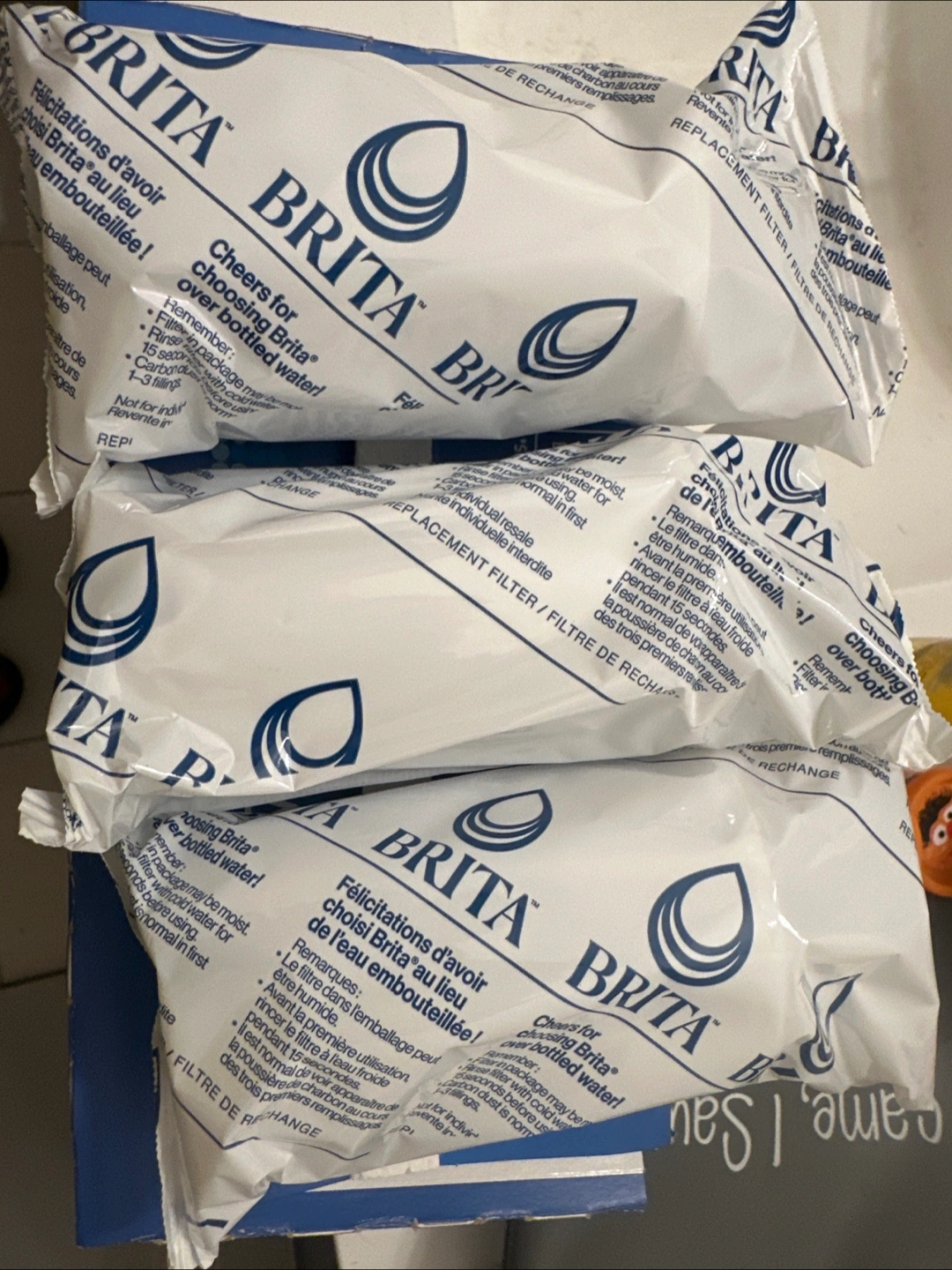 Three Brita replacement water filters. Filter should be rinsed before first use. Should be changed every 2 months