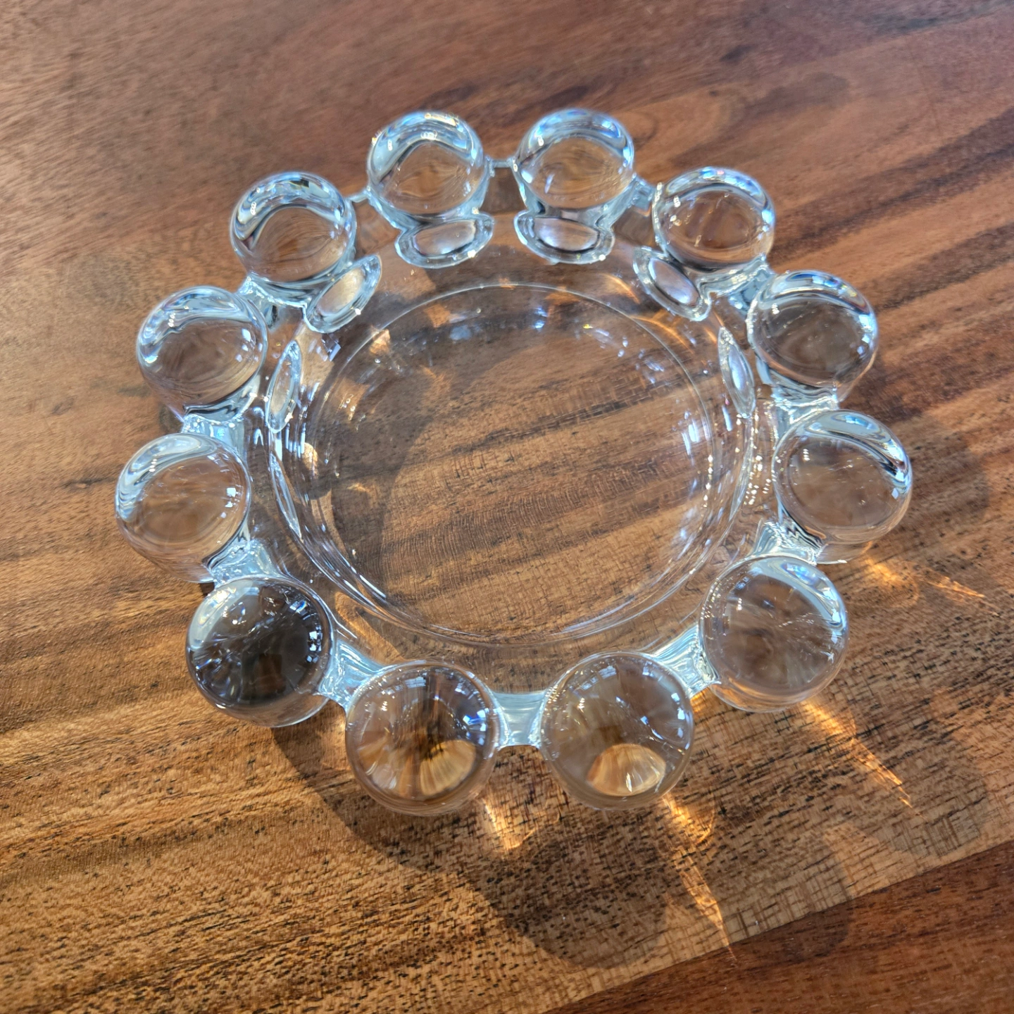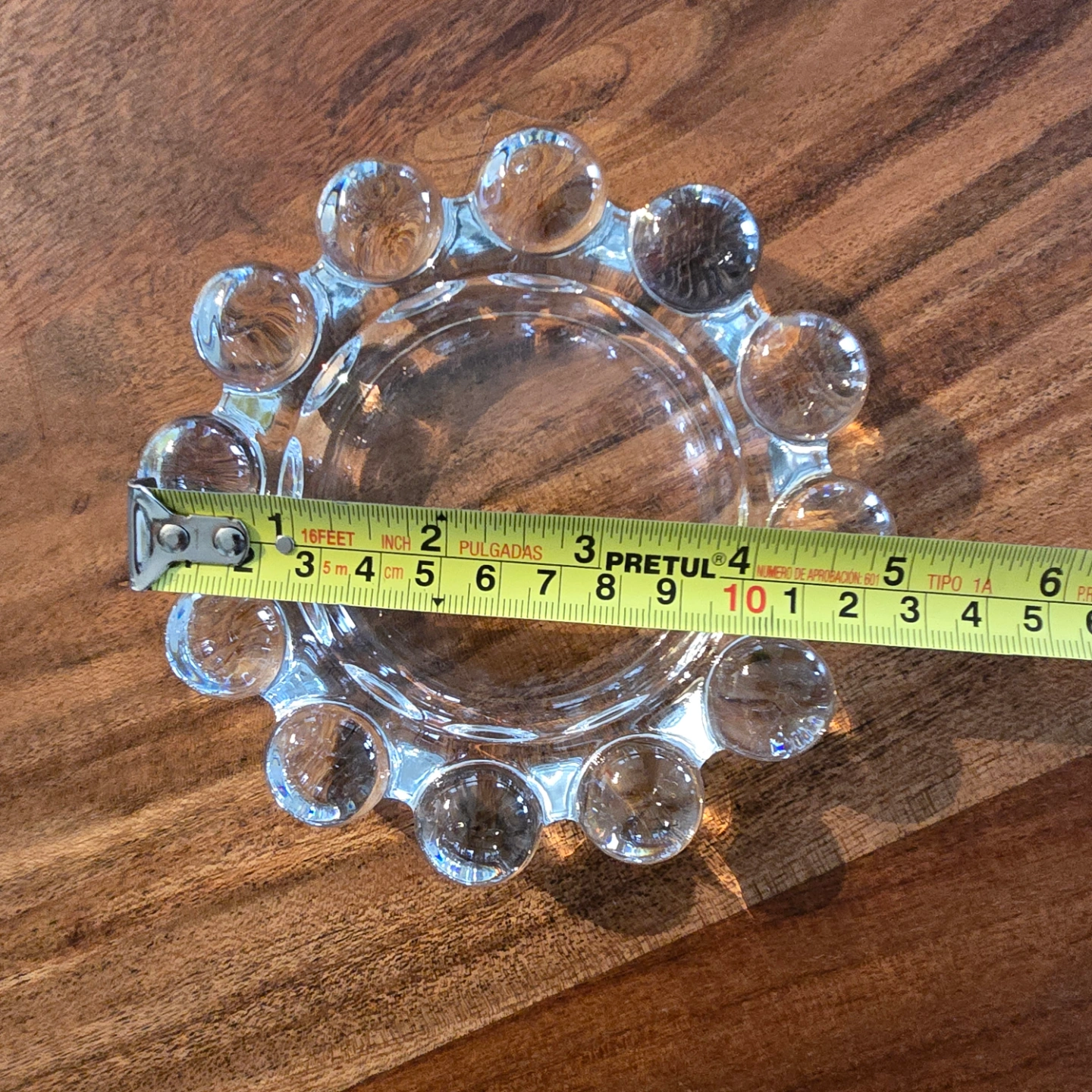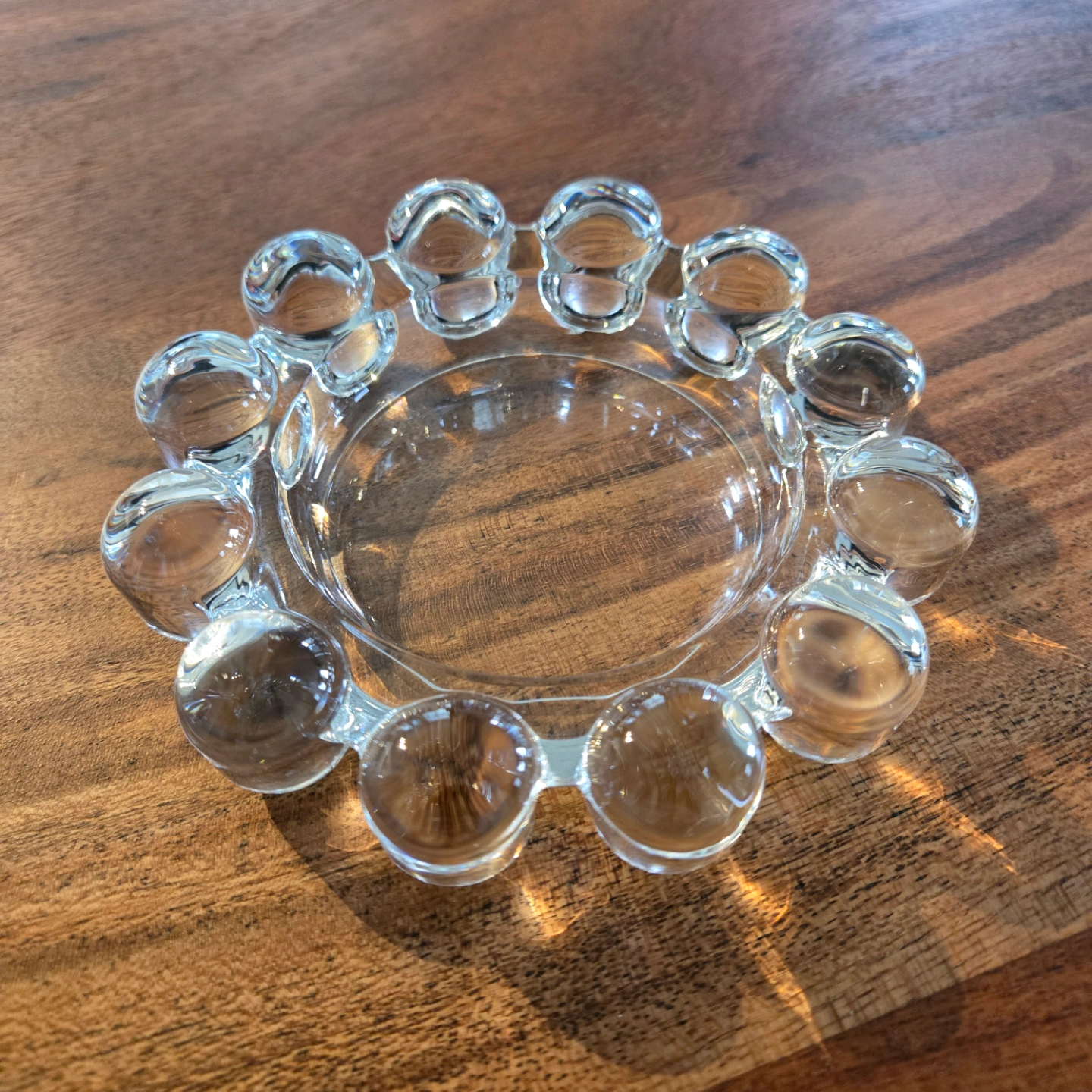 Small, clear glass ashtray. Features a unique bubbled edge. Diameter approximately 10cm. Unique vintage piece.
