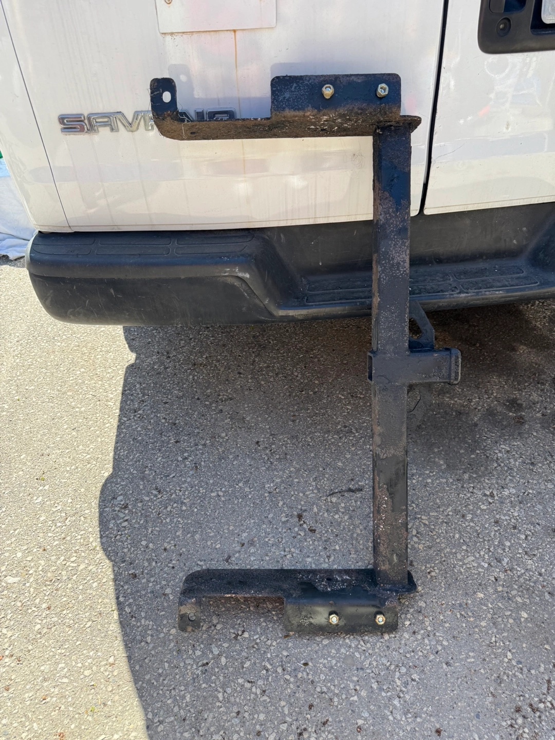 Used spare tire carrier. Fits a GMC Savana van. Some surface rust. Mounting hardware included.