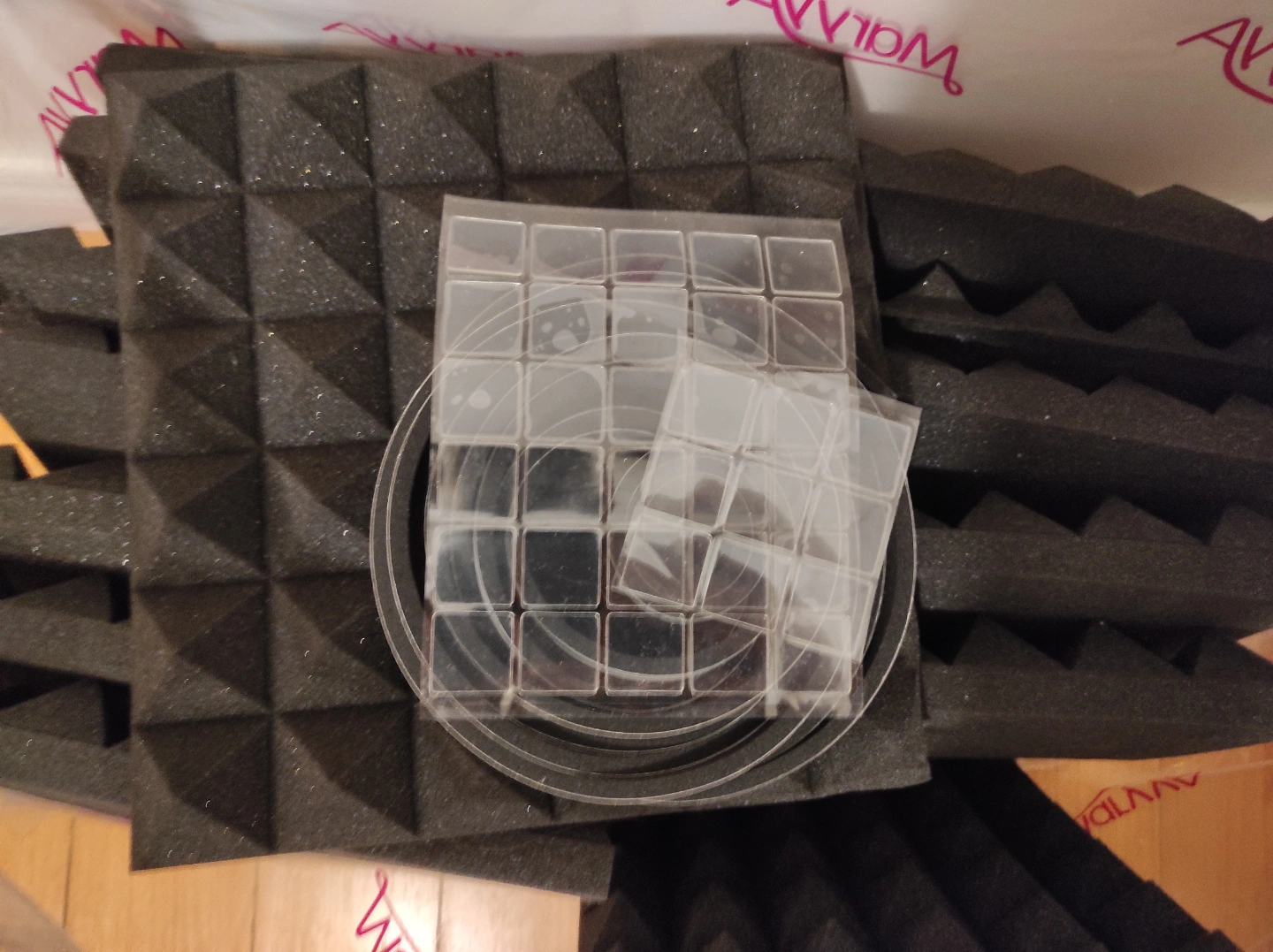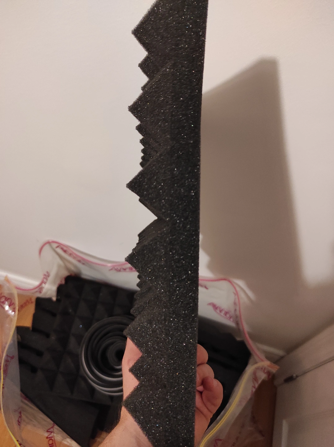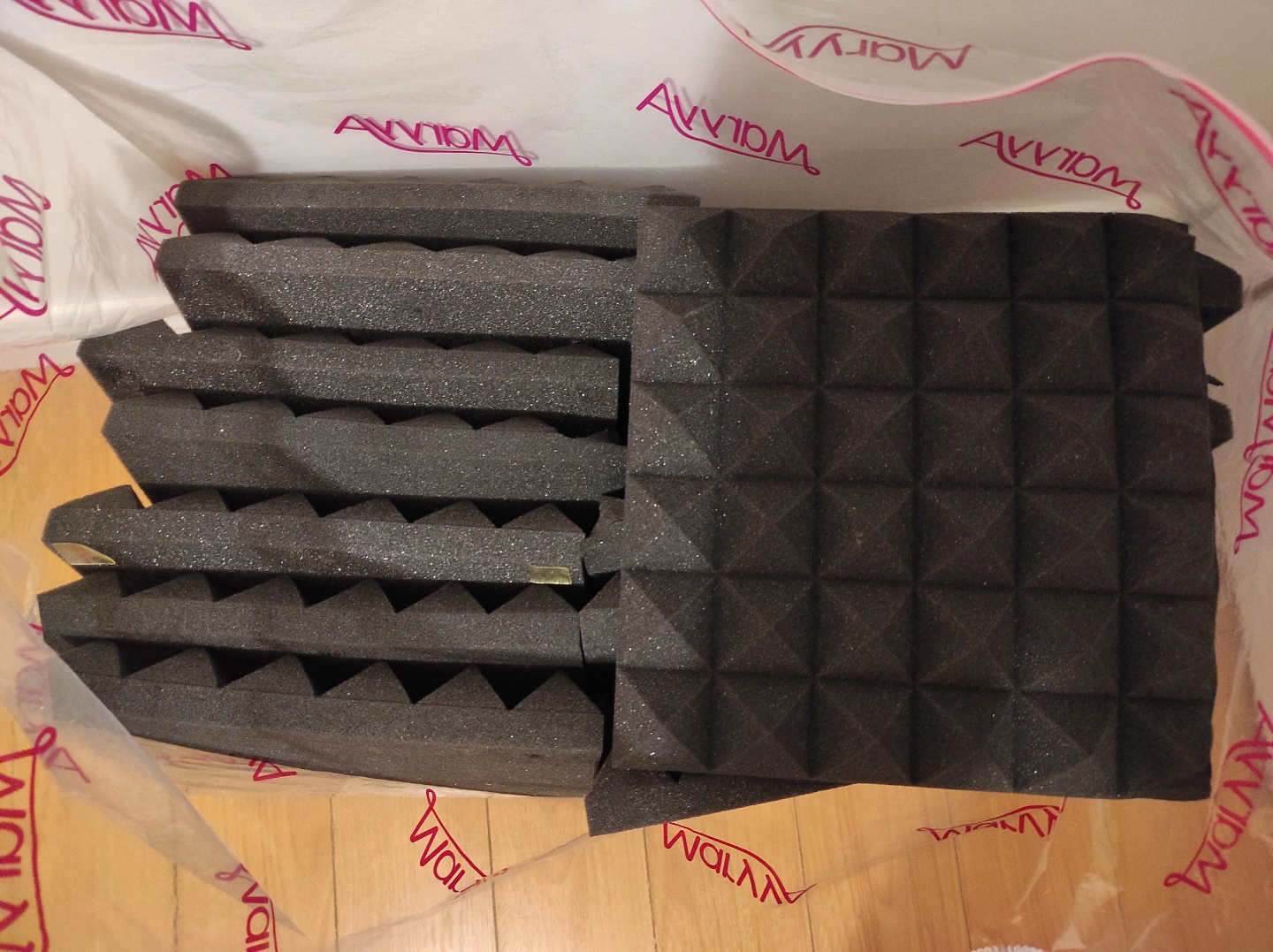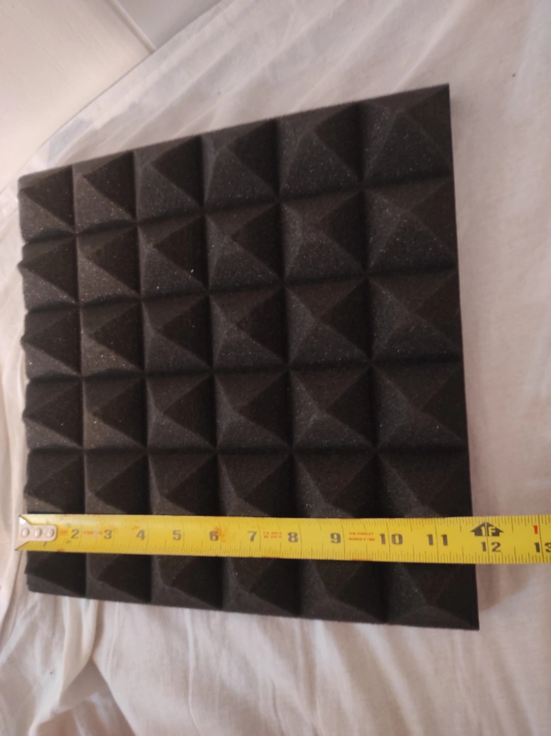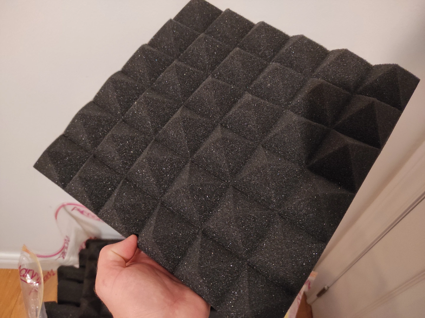 Set of acoustic foam tiles. Great for soundproofing studios or home theatres. Includes extra accessories. Black pyramid design. I have 20 pieces. So: 20 pieces × 1 sq ft = 20 sq ft