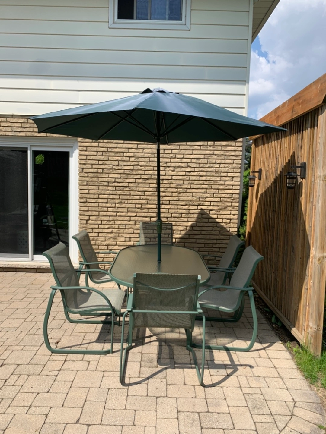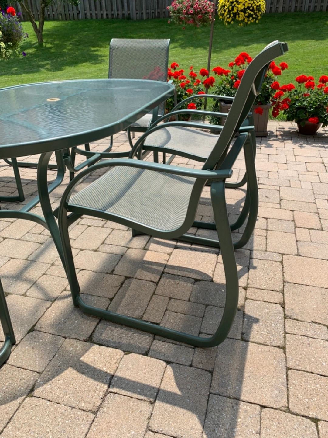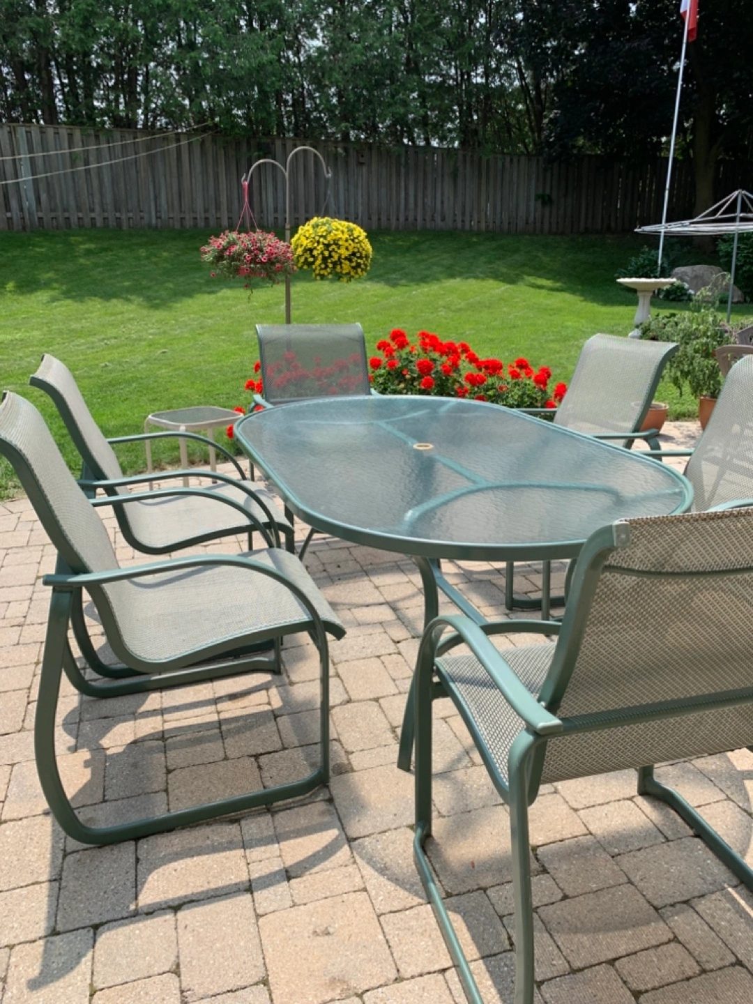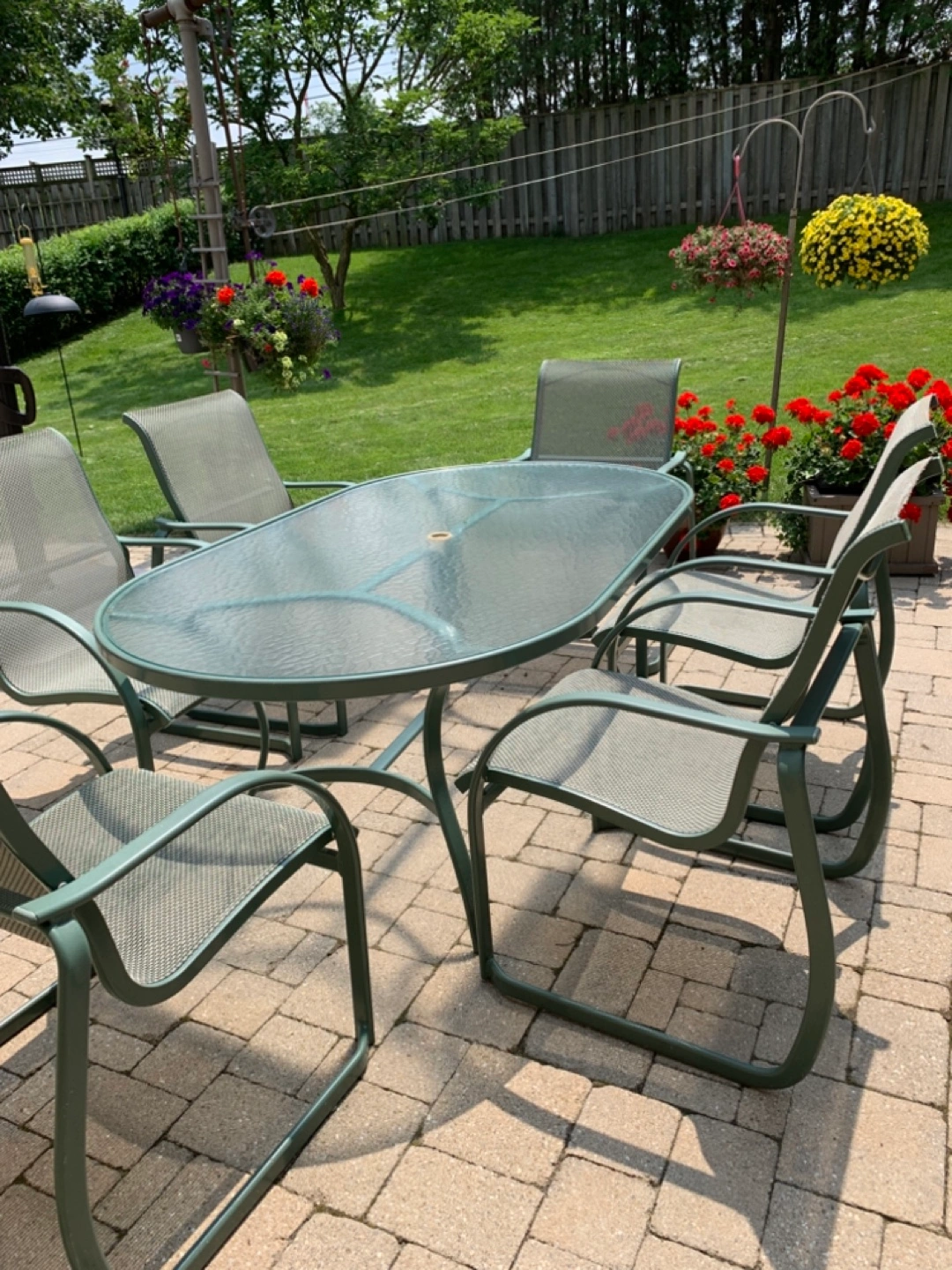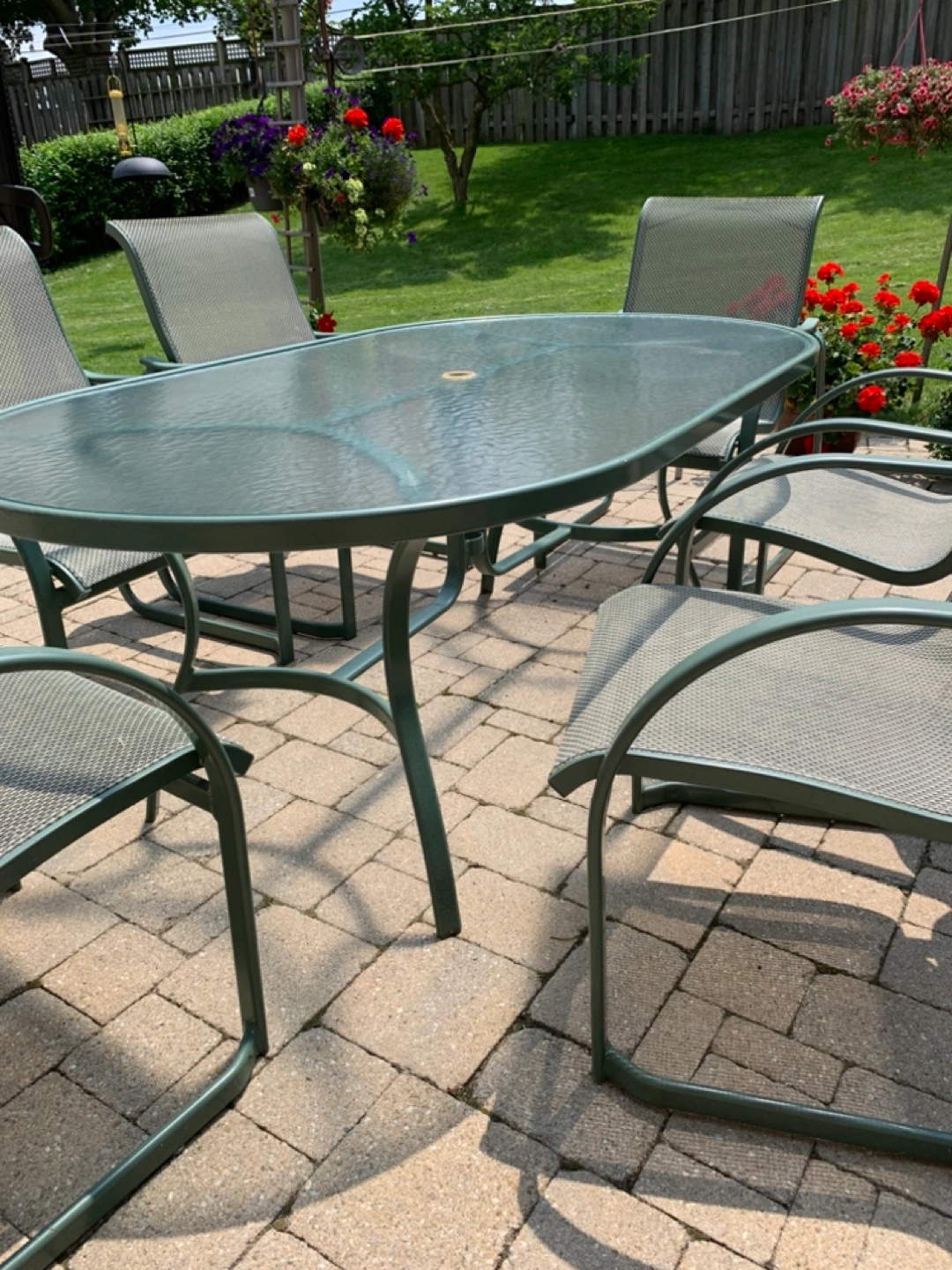 Outdoor patio furniture set. Includes six chairs and one oval glass-top table. Aluminum frames with mesh seating. Mesh on chairs are starting to wear so we bought cushions for them which are included in the deal. Other than that the frames of the furniture is solid with no rust. Also, umbrella and stand included.
