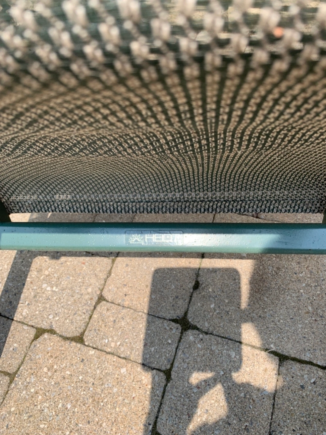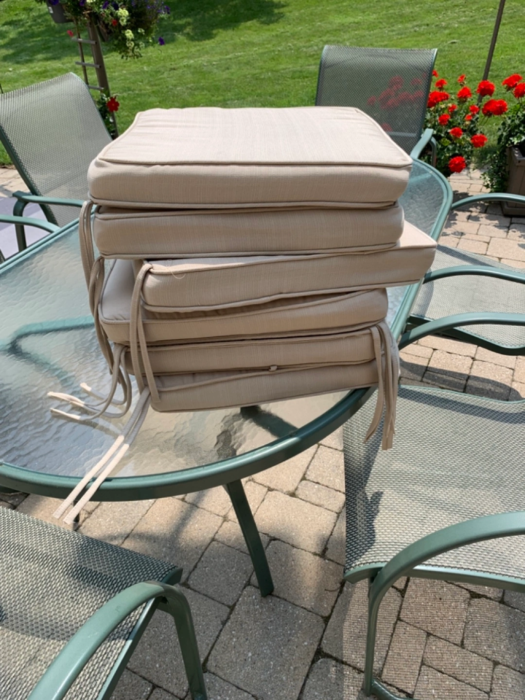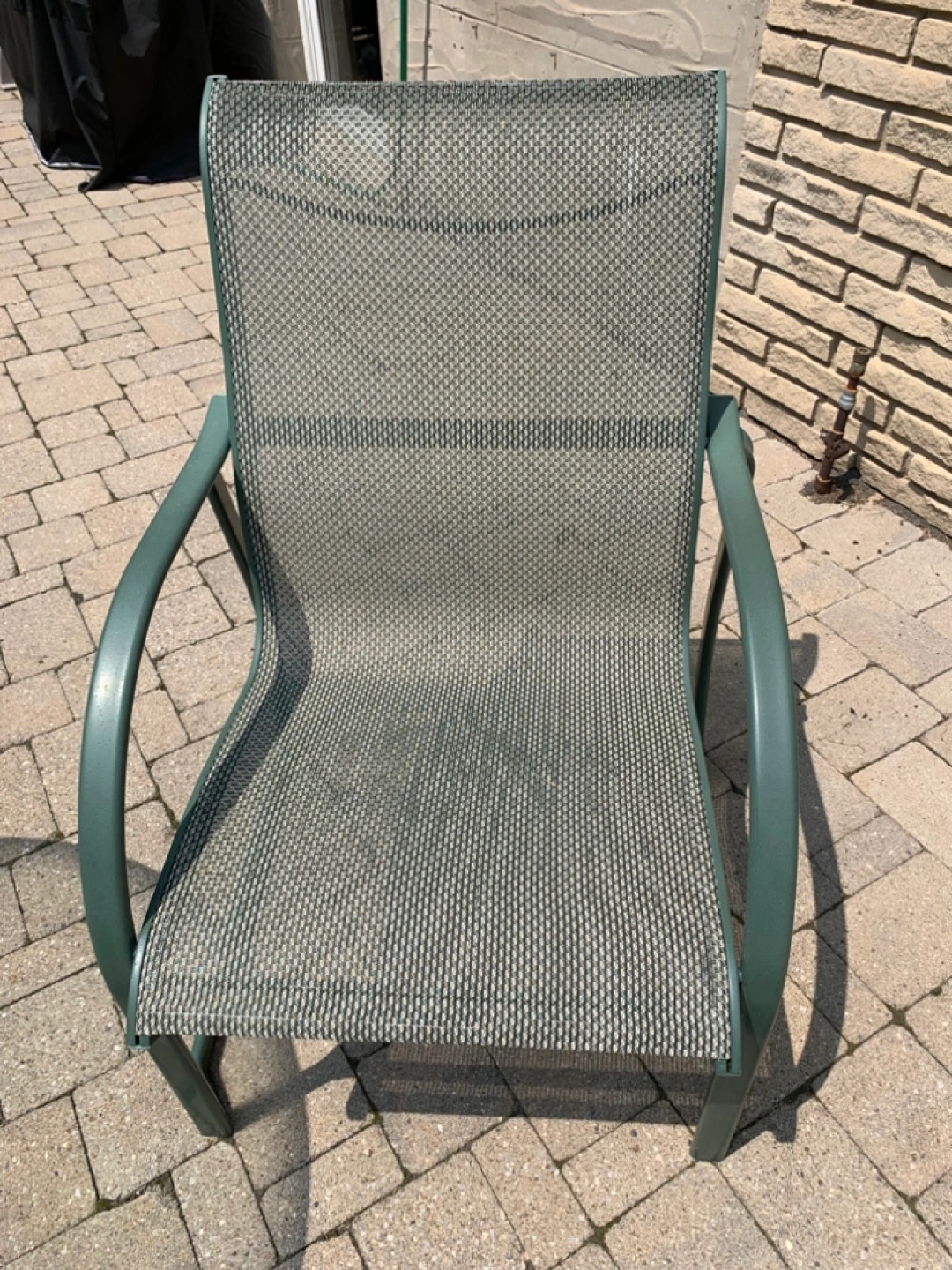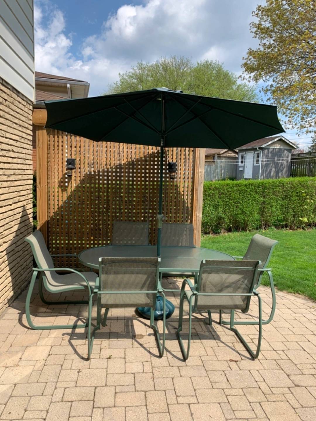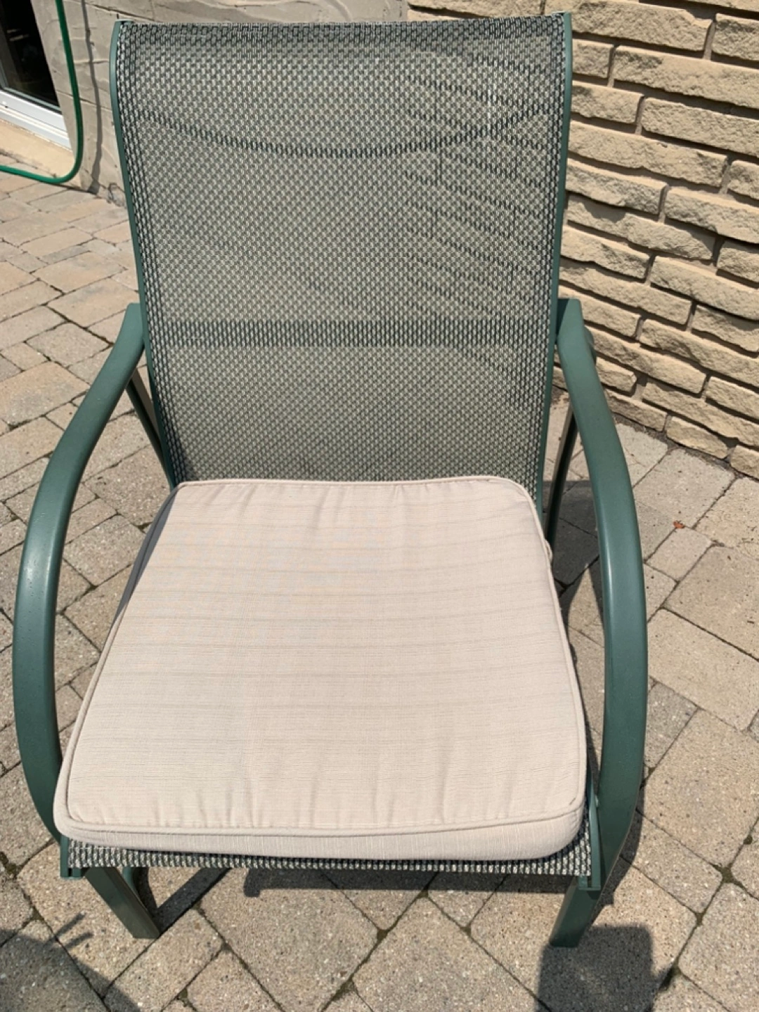 Outdoor patio furniture set. Includes six chairs and one oval glass-top table. Aluminum frames with mesh seating. Mesh on chairs are starting to wear so we bought cushions for them which are included in the deal. Other than that the frames of the furniture is solid with no rust. Also, umbrella and stand included.