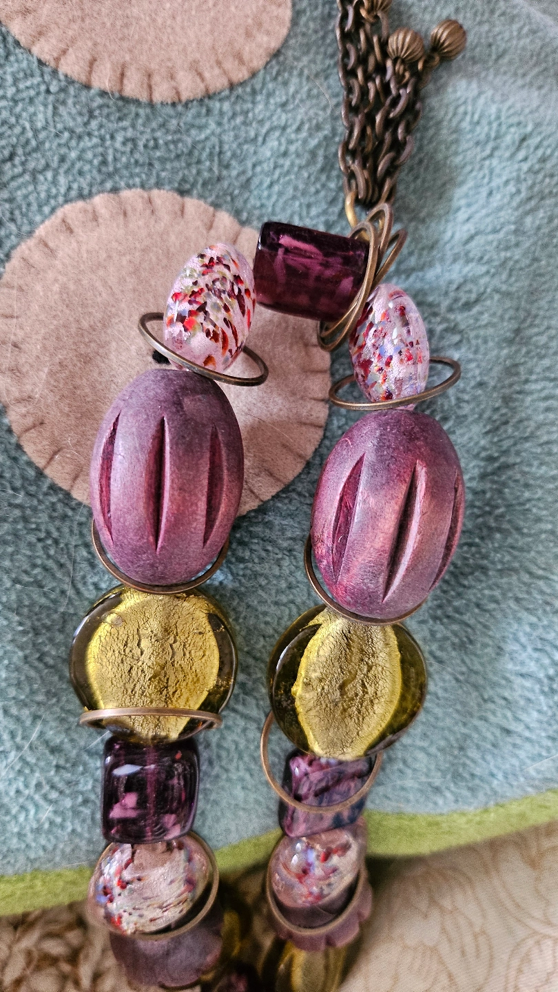 Gorgeous vintage handcrafted choker necklace. From the '70s. Features various coloured beads, including purple, yellow and speckled glass beads. Wooden beads with carved detailing. Bronze chain detail. Lobster clasp closure. Available for pick-up near Oakwood Village.