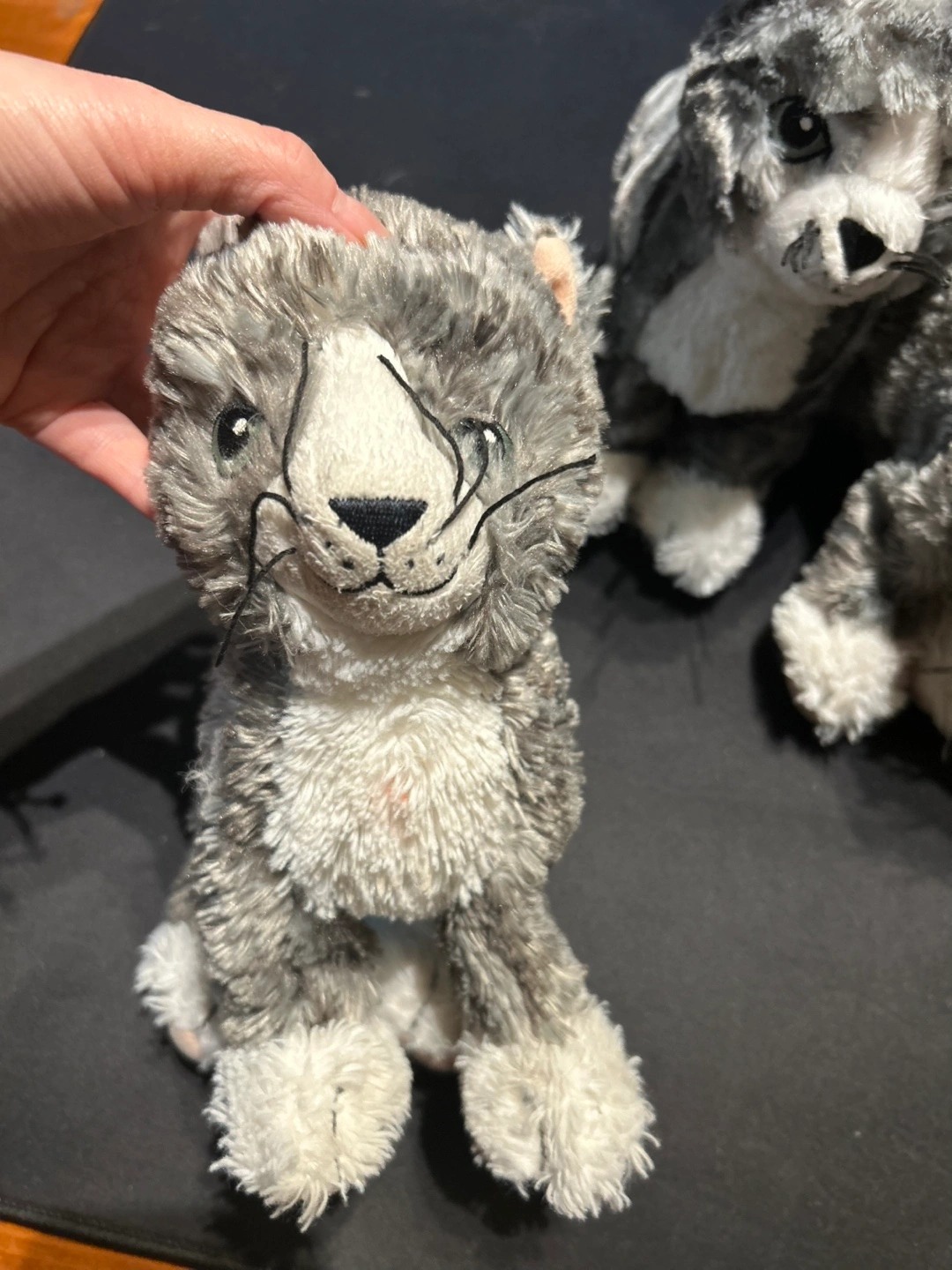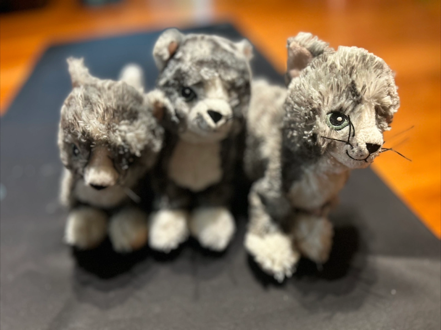 Set of three grey kitten plush toys. Adorable and soft. Small size. Suitable for children or collectors.