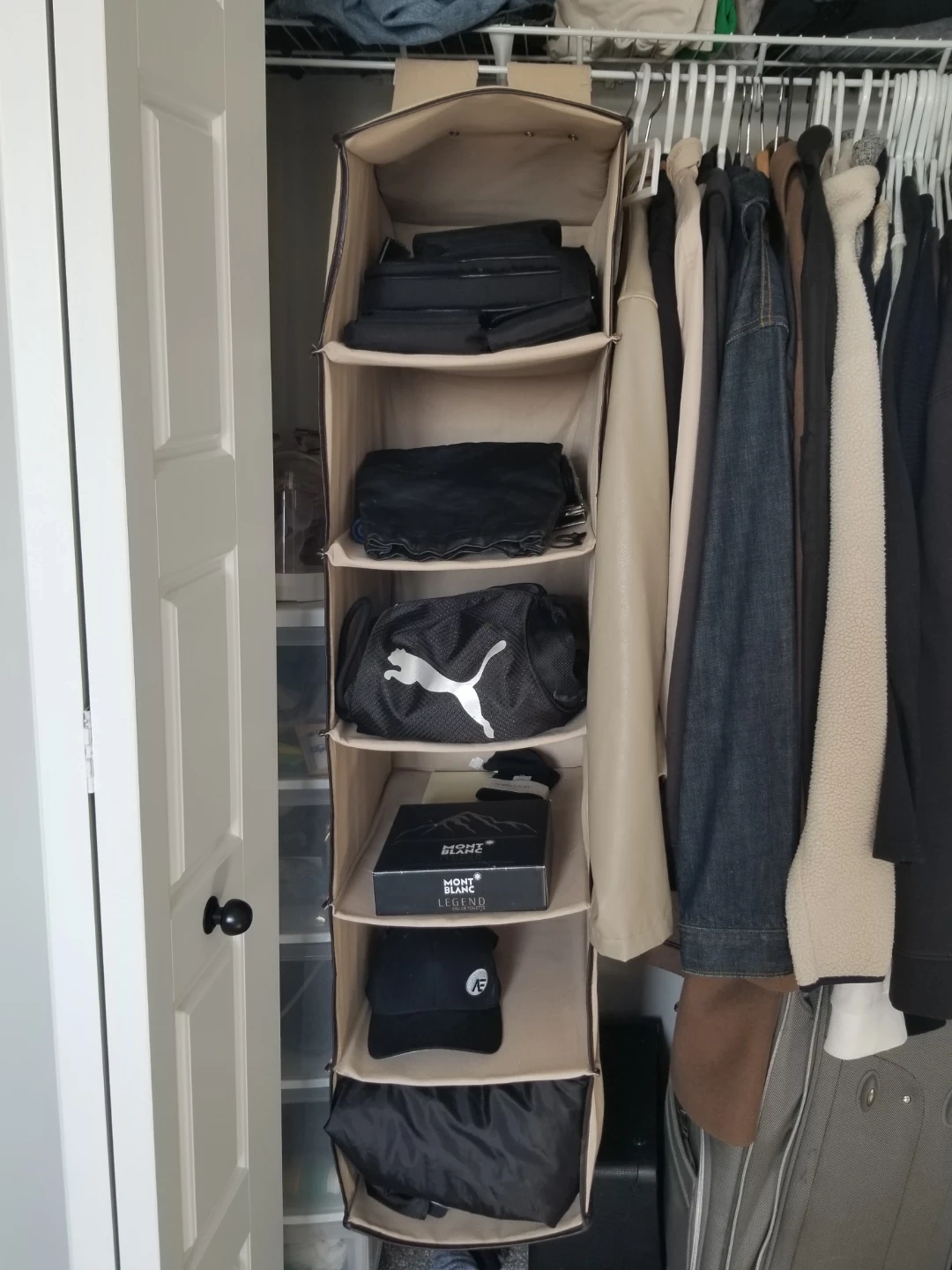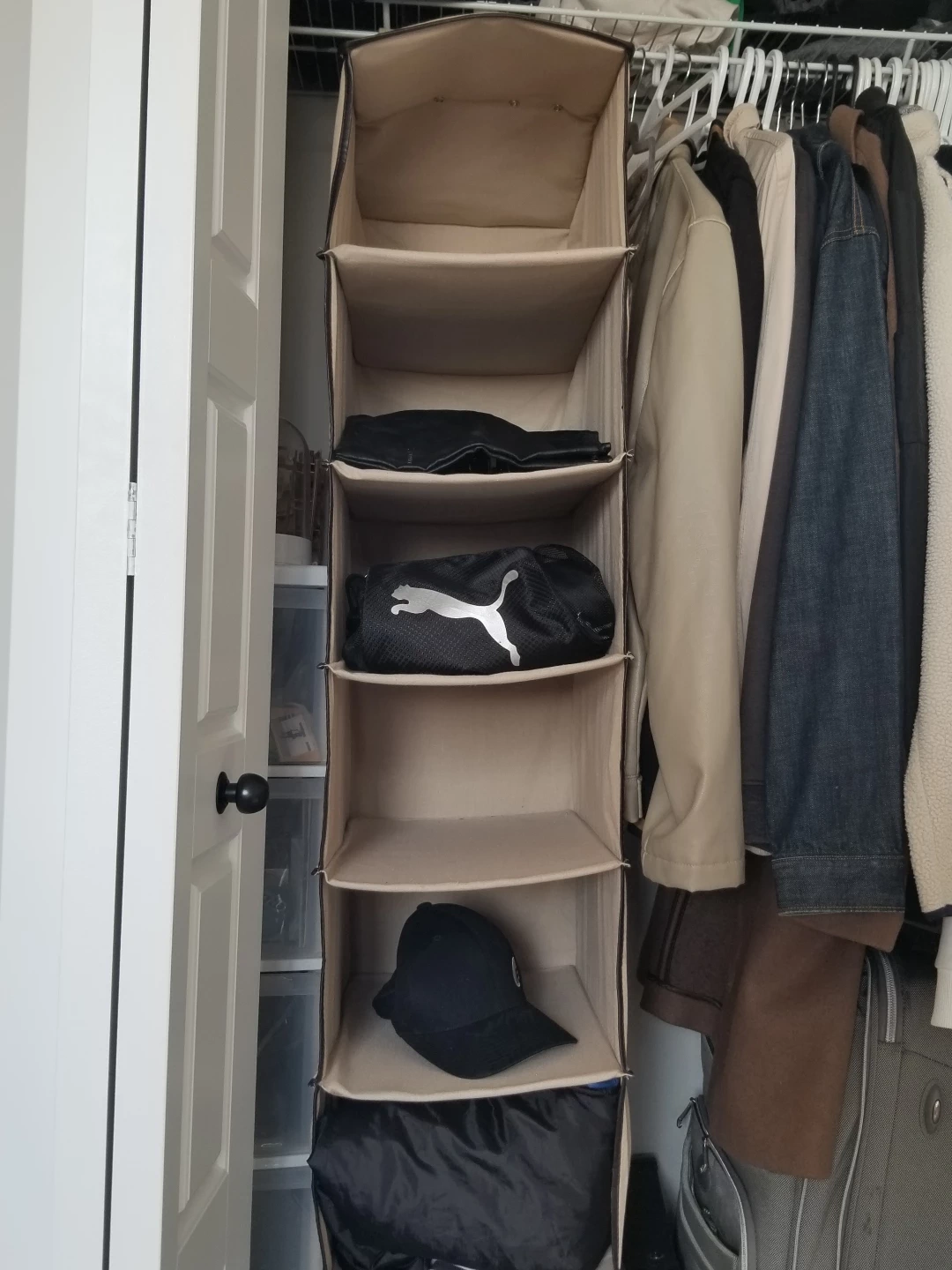 Beige fabric hanging organizer. Six shelves for storing clothes, accessories, and more. Perfect for closets and maximizing space. Great for organizing your wardrobe.