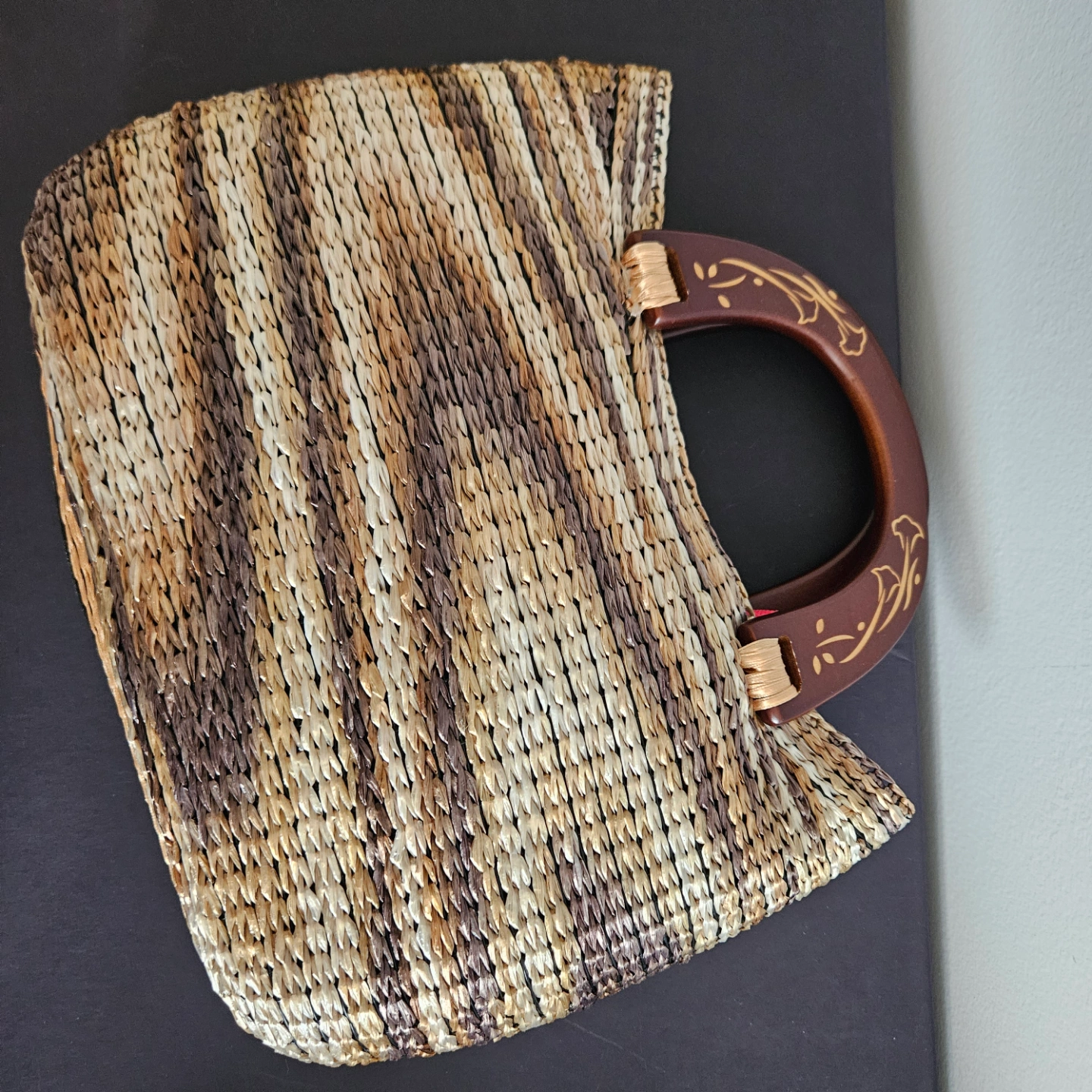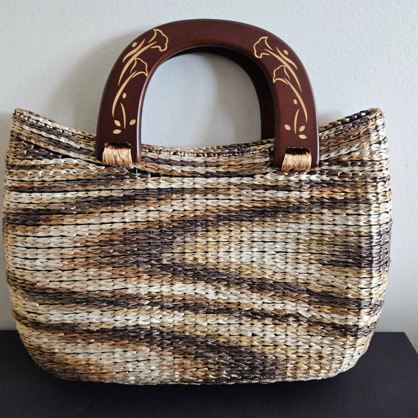 Stylish and practical handbag. Woven straw construction. Features a unique dark brown wooden handle with floral carvings. Perfect for summer outings.