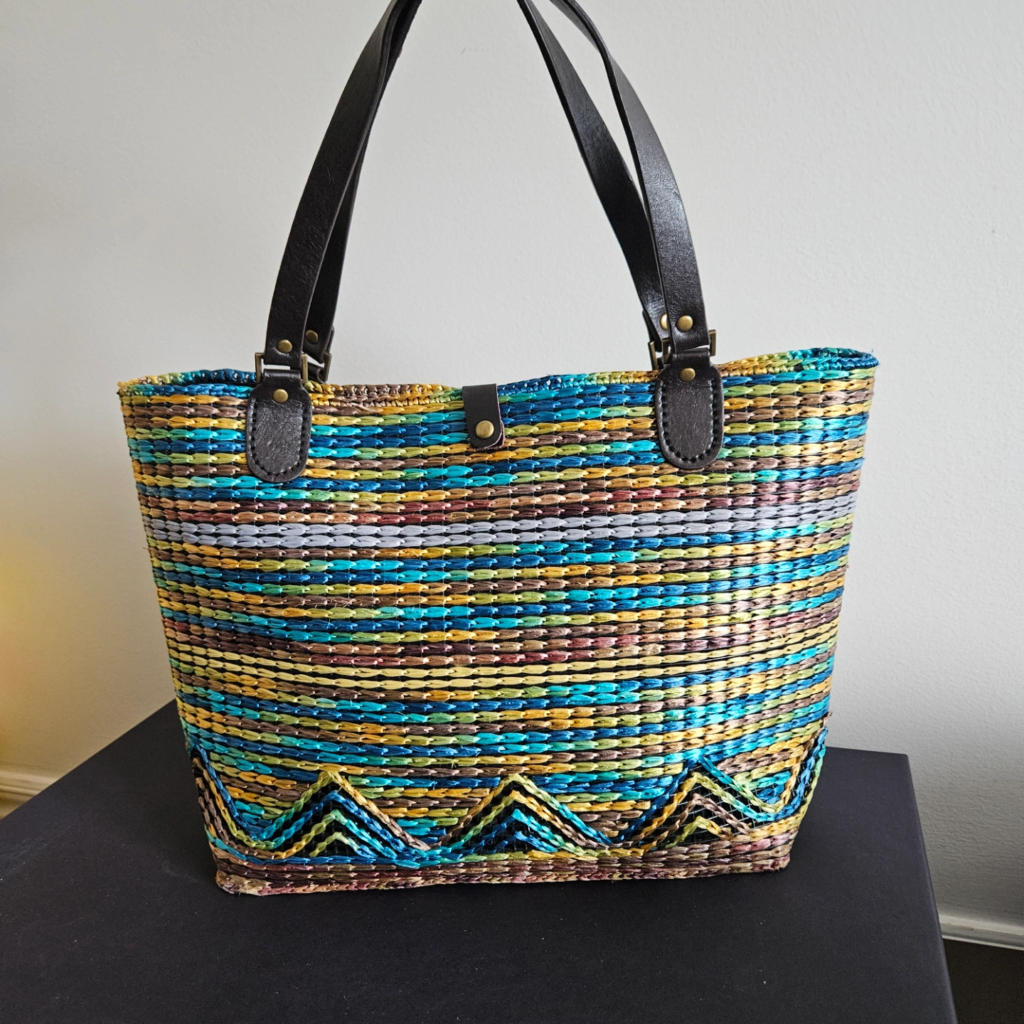 Multicoloured woven tote bag. Features leather handles and a unique striped pattern. Perfect for summer.