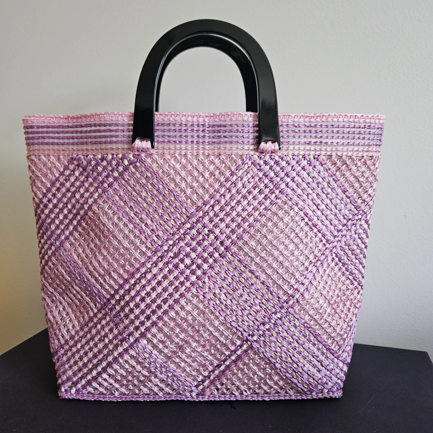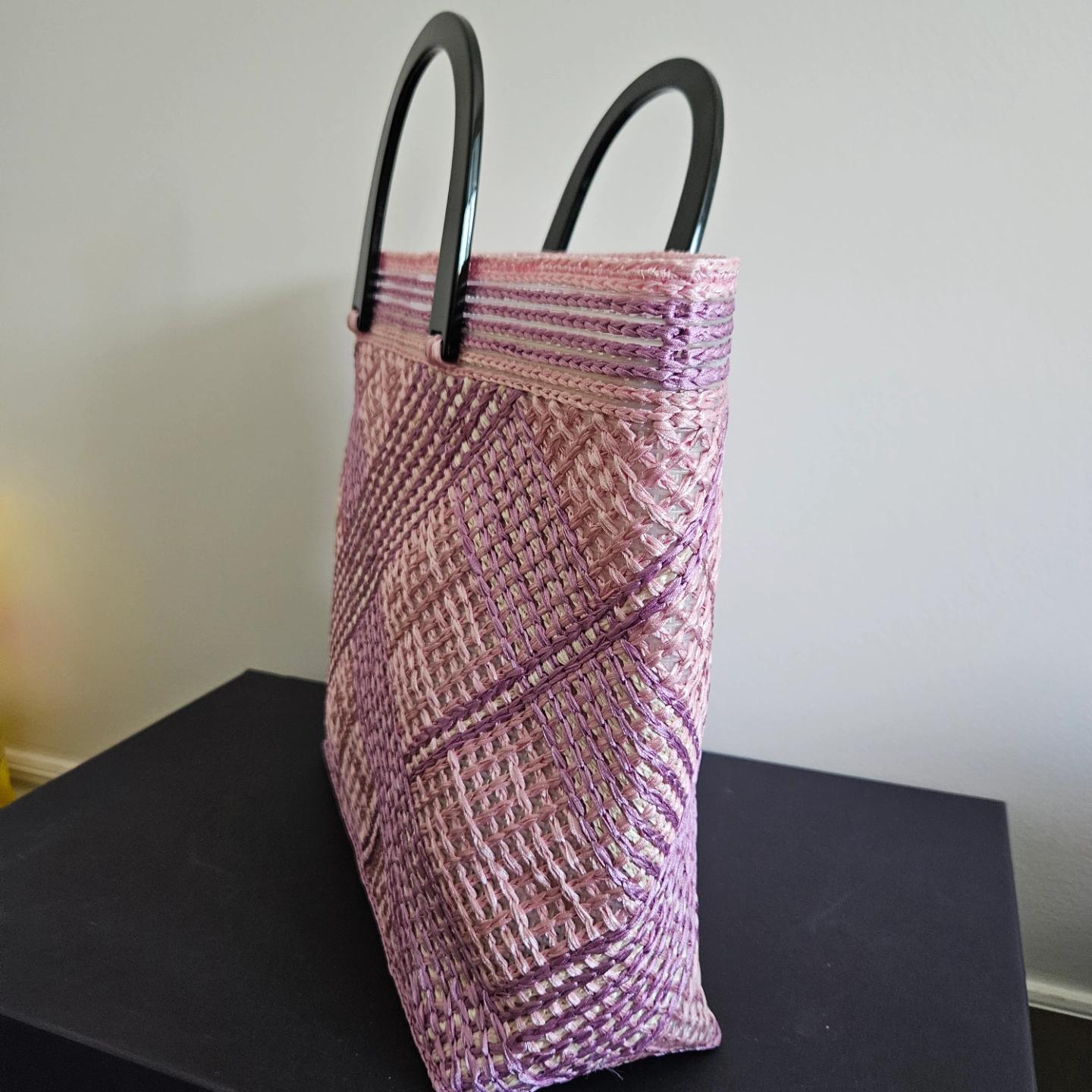 Beautiful woven tote bag. Features a unique purple and pink woven design. Black wooden handles. Perfect for shopping or everyday use.