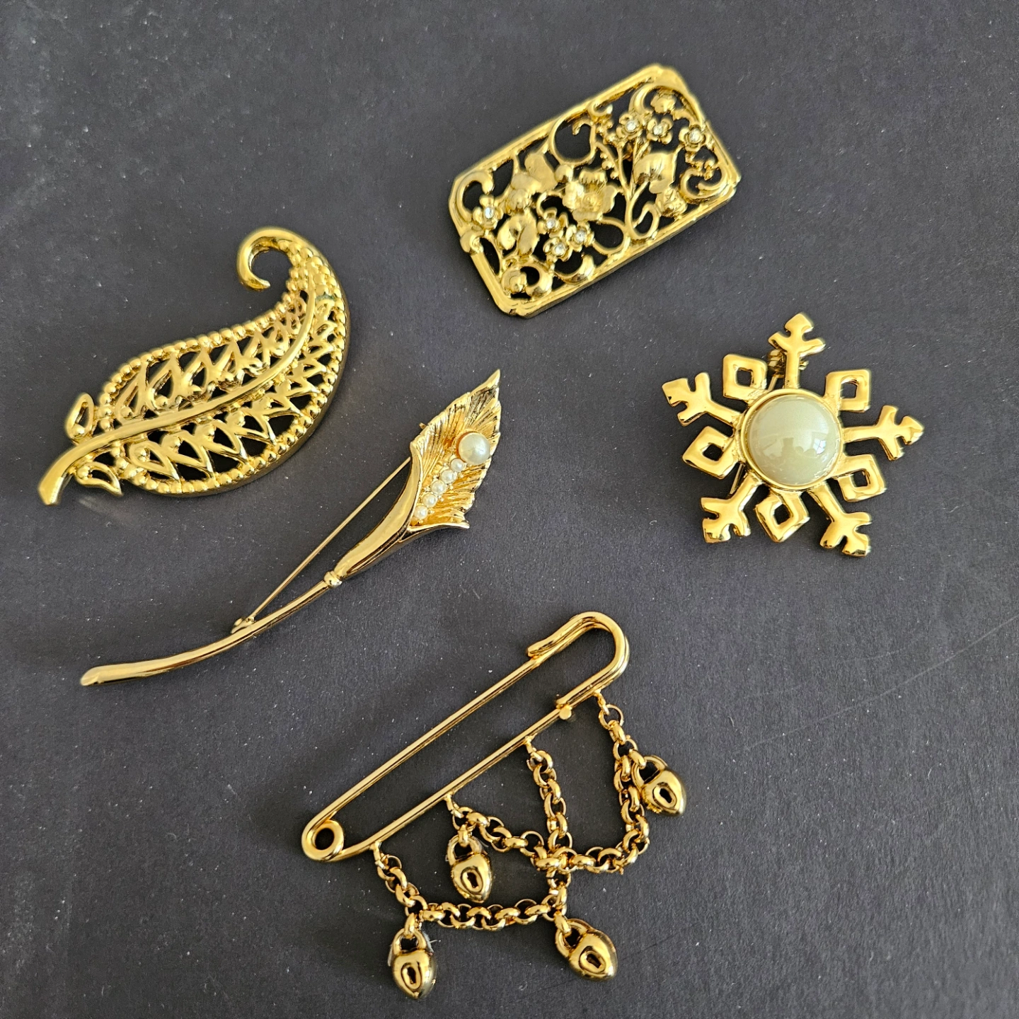 Set of four gold tone brooches. Features various designs including leaf, floral, snowflake, and dangling chain accents. Excellent for adding a touch of vintage elegance to your outfit.