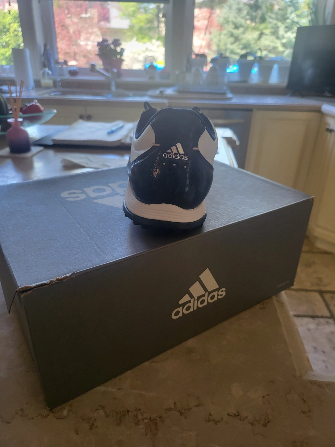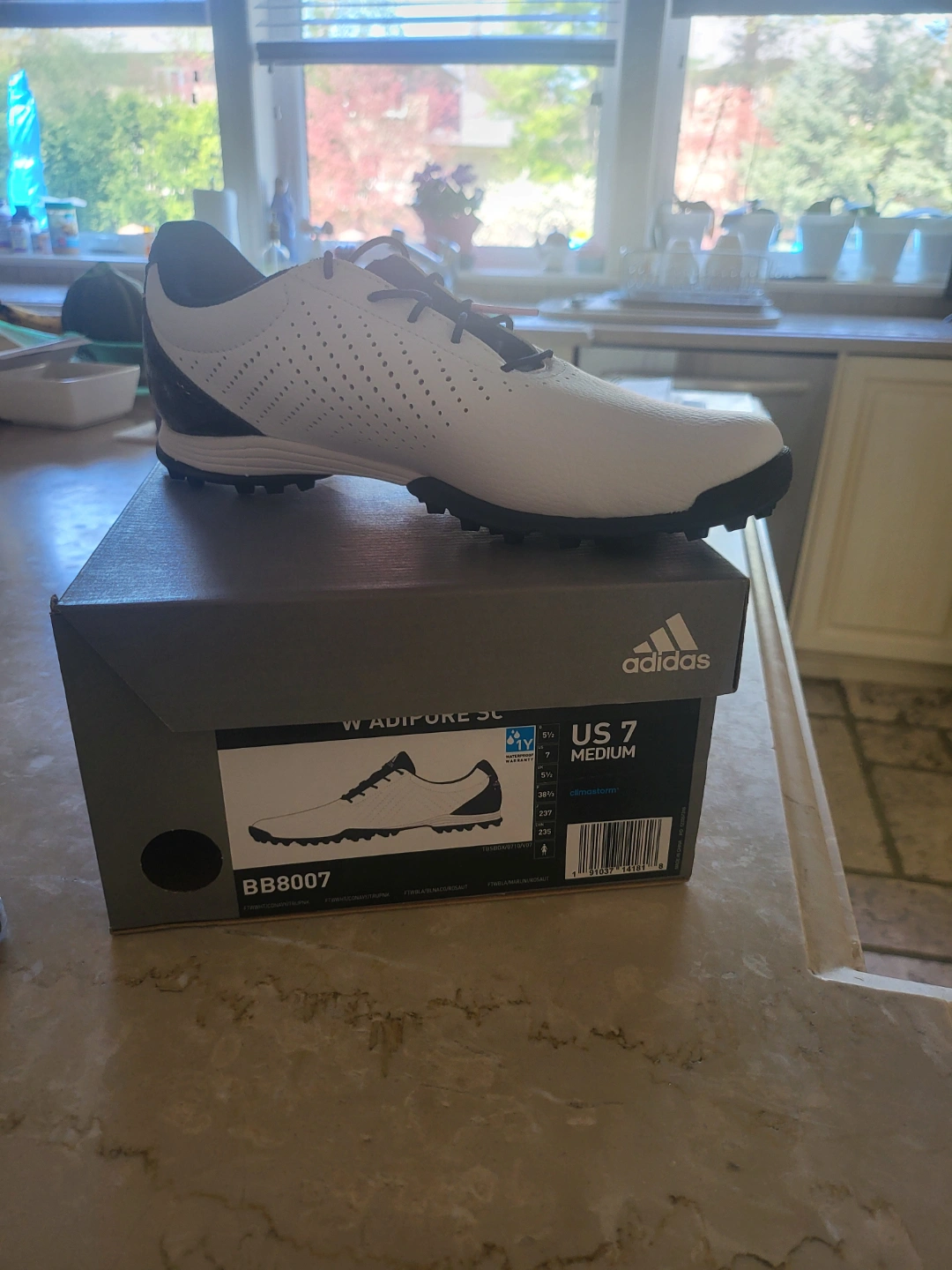 Women's Adidas Adipure Sp golf shoes. Size 7. White and black. Spiked sole. Excellent condition. Comes in original box. never worn. bought wrong size