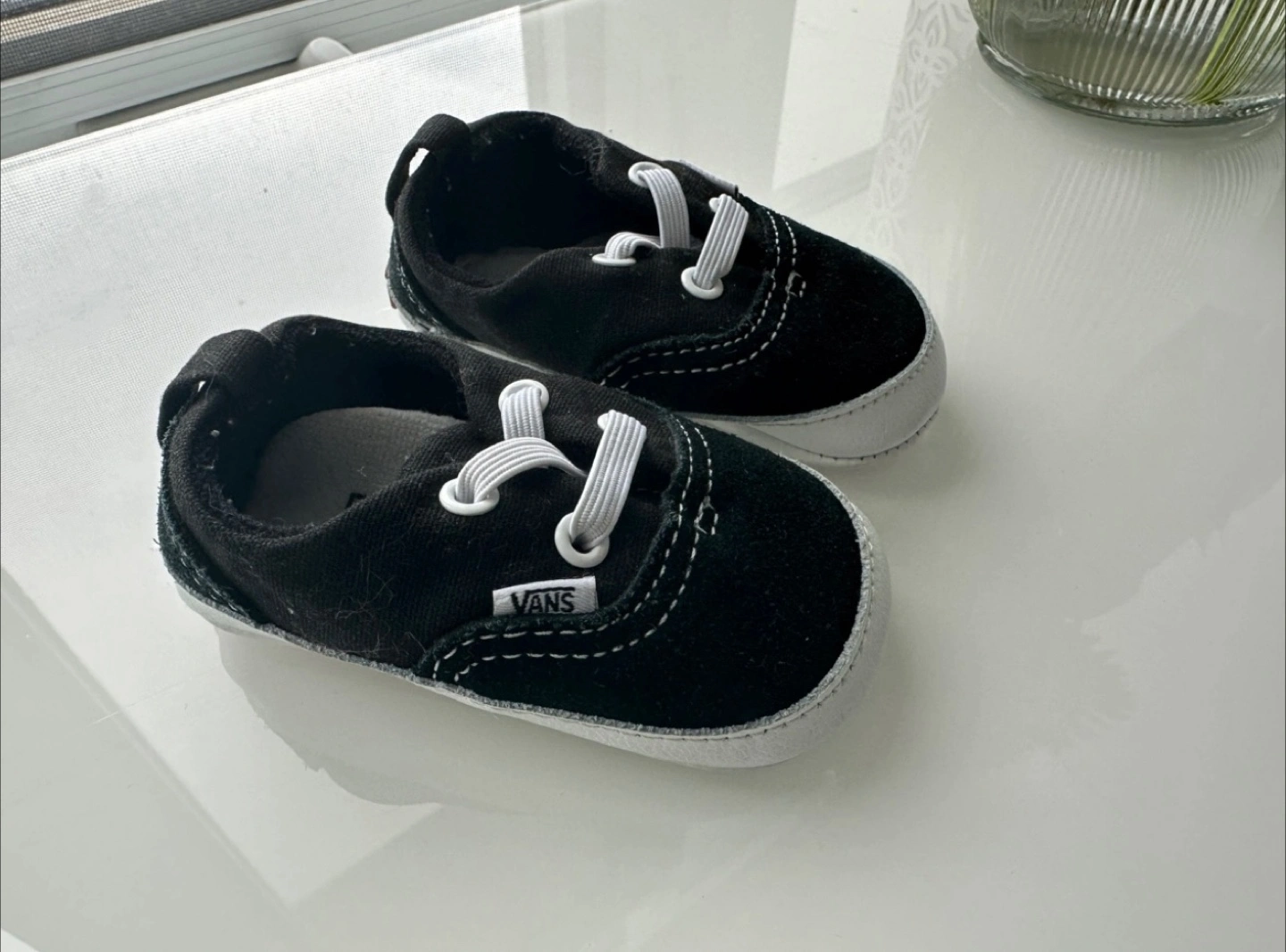 Black baby Vans shoes. Soft material. White laces. Waffle-patterned soles. Great for little feet. $5 minimum spend to arrange pick up🙂