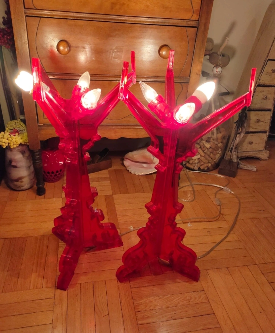 Unique pair of red lucite lamps. Features a sculptural, tree-like design. Each lamp has multiple light bulbs. Mid-century modern style.