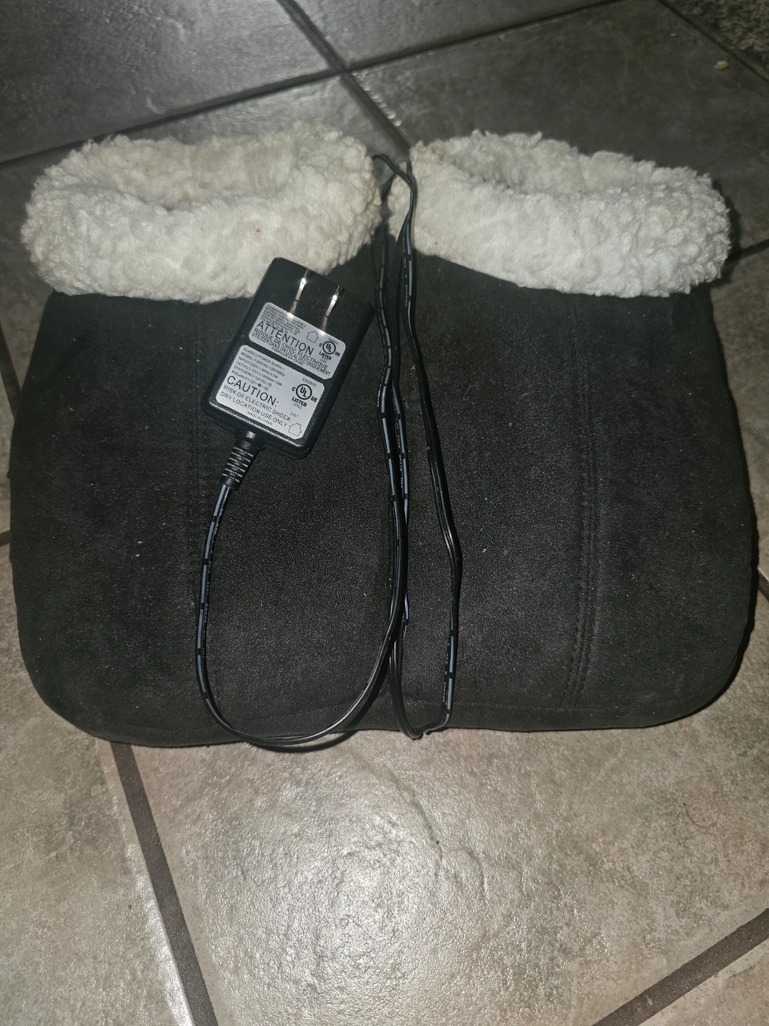 Heated slippers, black with fluffy white lining. Includes power cord and adapter. Great for cold weather.