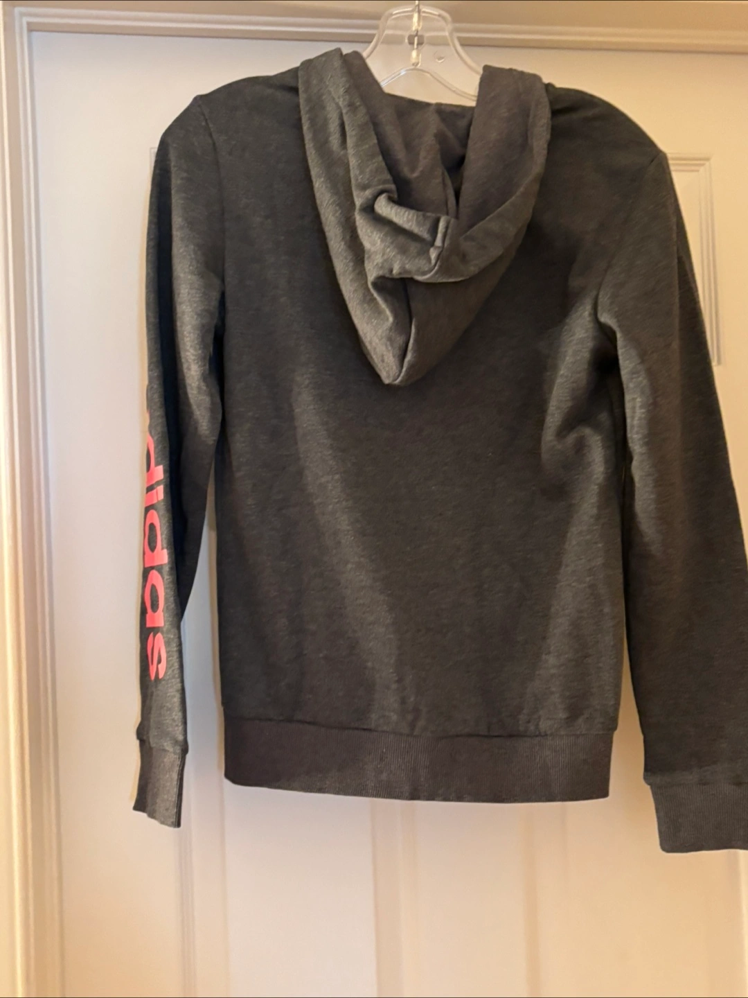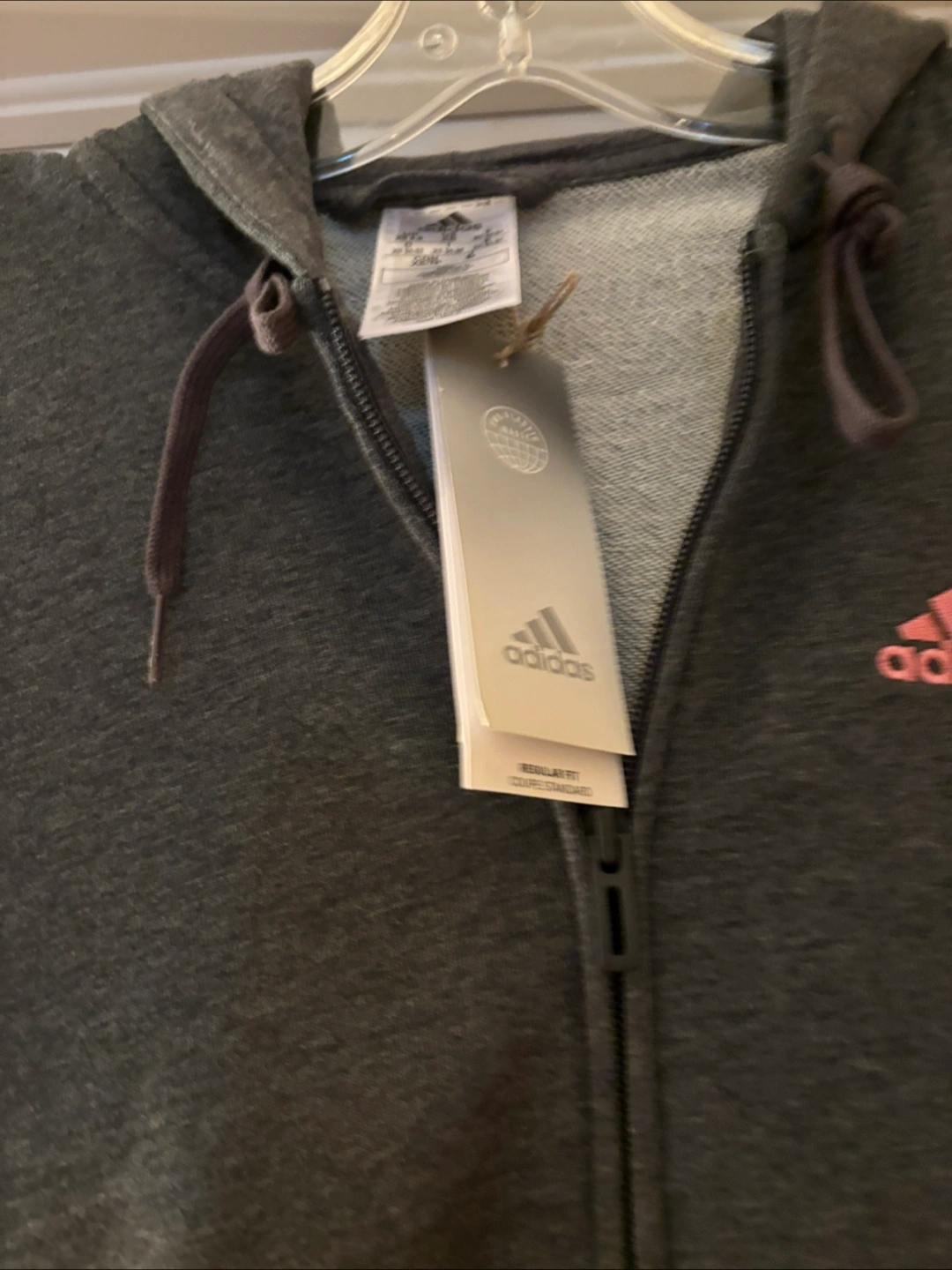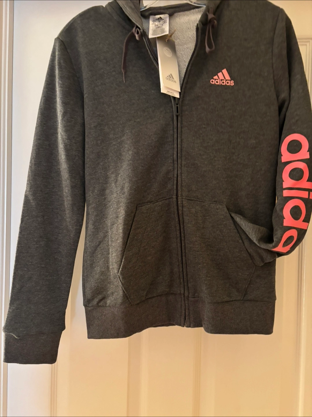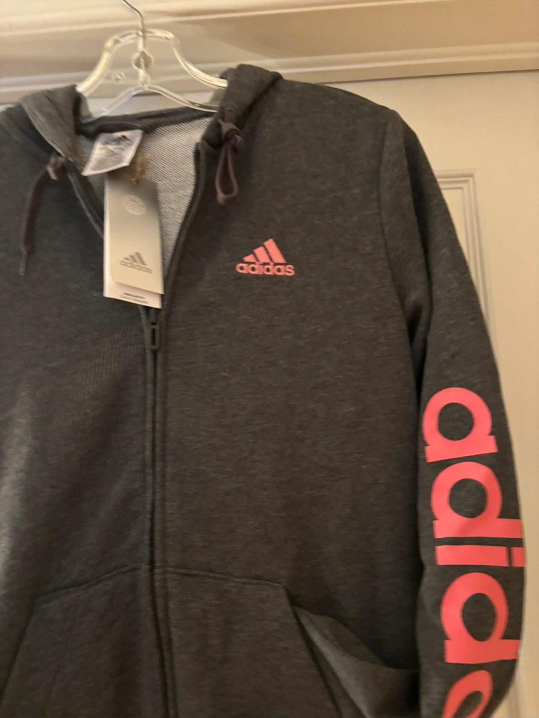 Women's Adidas zip-up hoodie. Grey with pink Adidas logo. Size small. New with tags. Adidas on the sleeve in contrast pink.