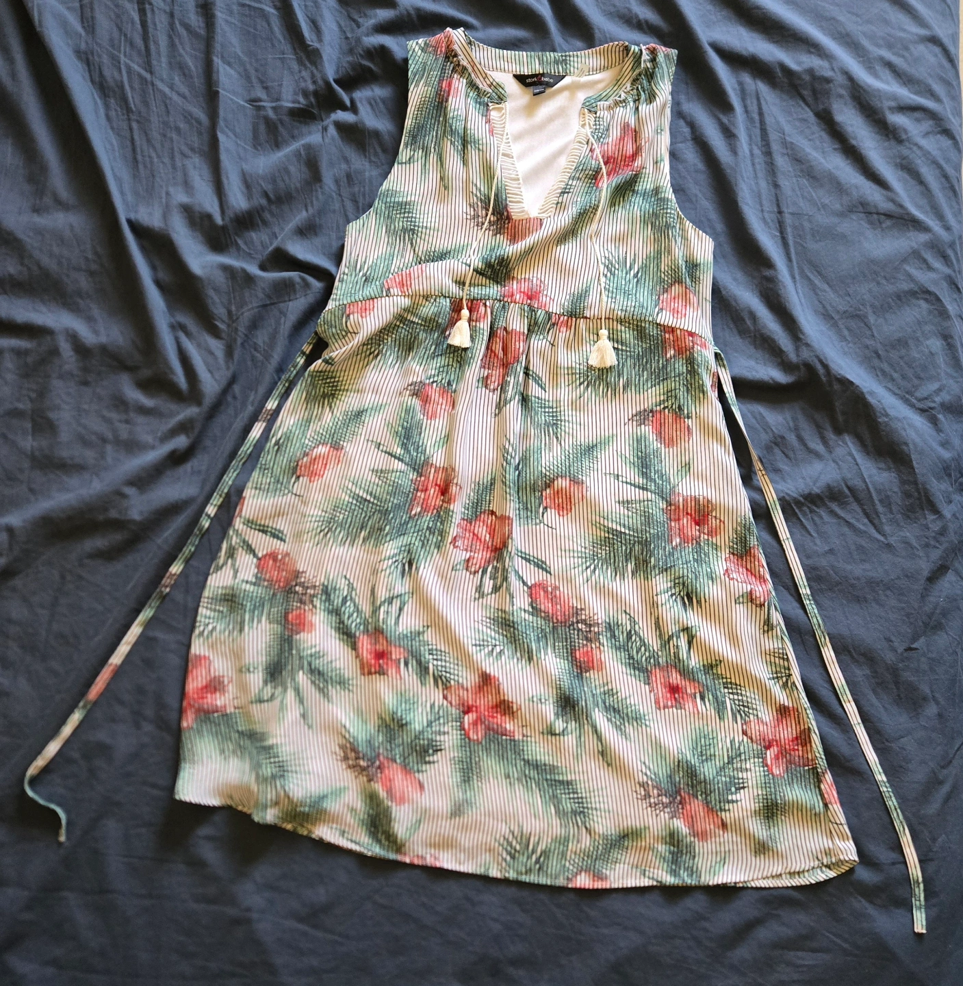 Lightweight sleeveless dress. Features a V-neck, thin straps, and a tropical print on a striped background. Side tie details. Perfect for summer. pick up Notre Dame ave. willing to meet downtown.