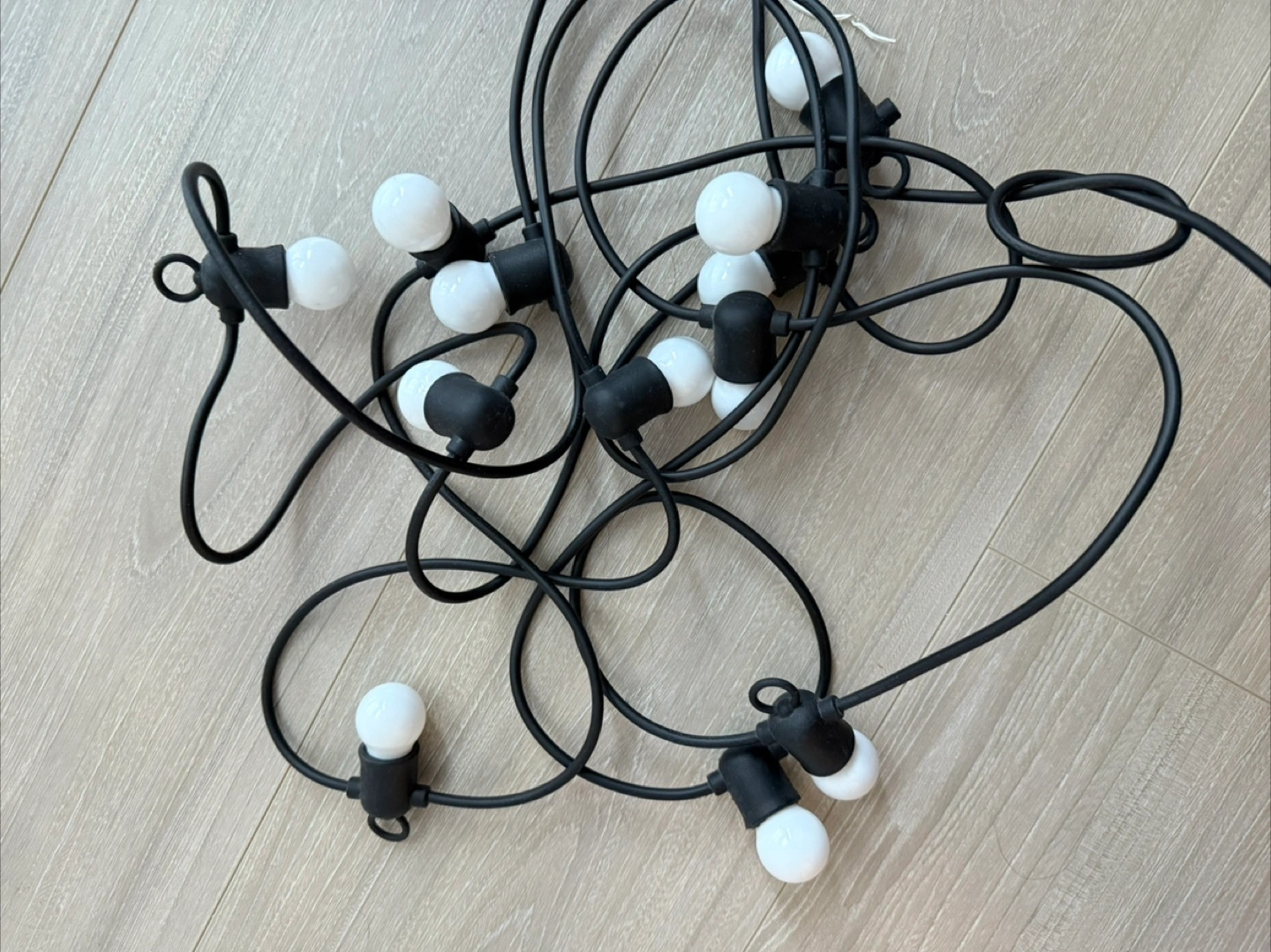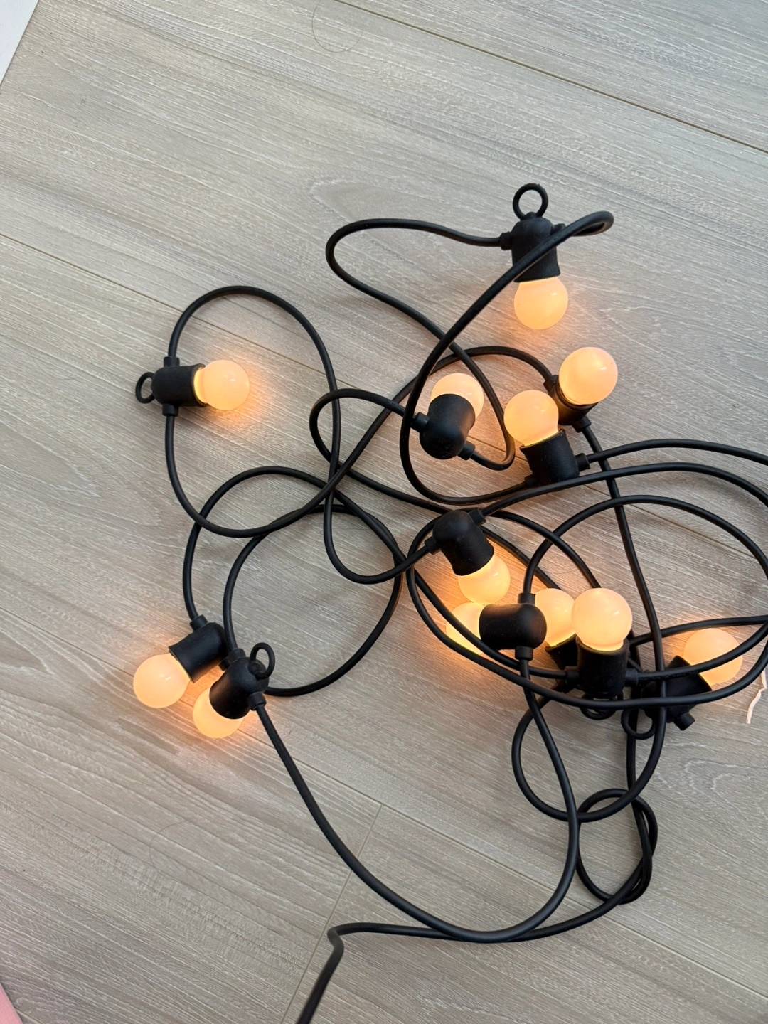 String of LED Edison bulb lights. Black cord. Warm white light. Perfect for indoor or outdoor use. Untangled and ready to use.