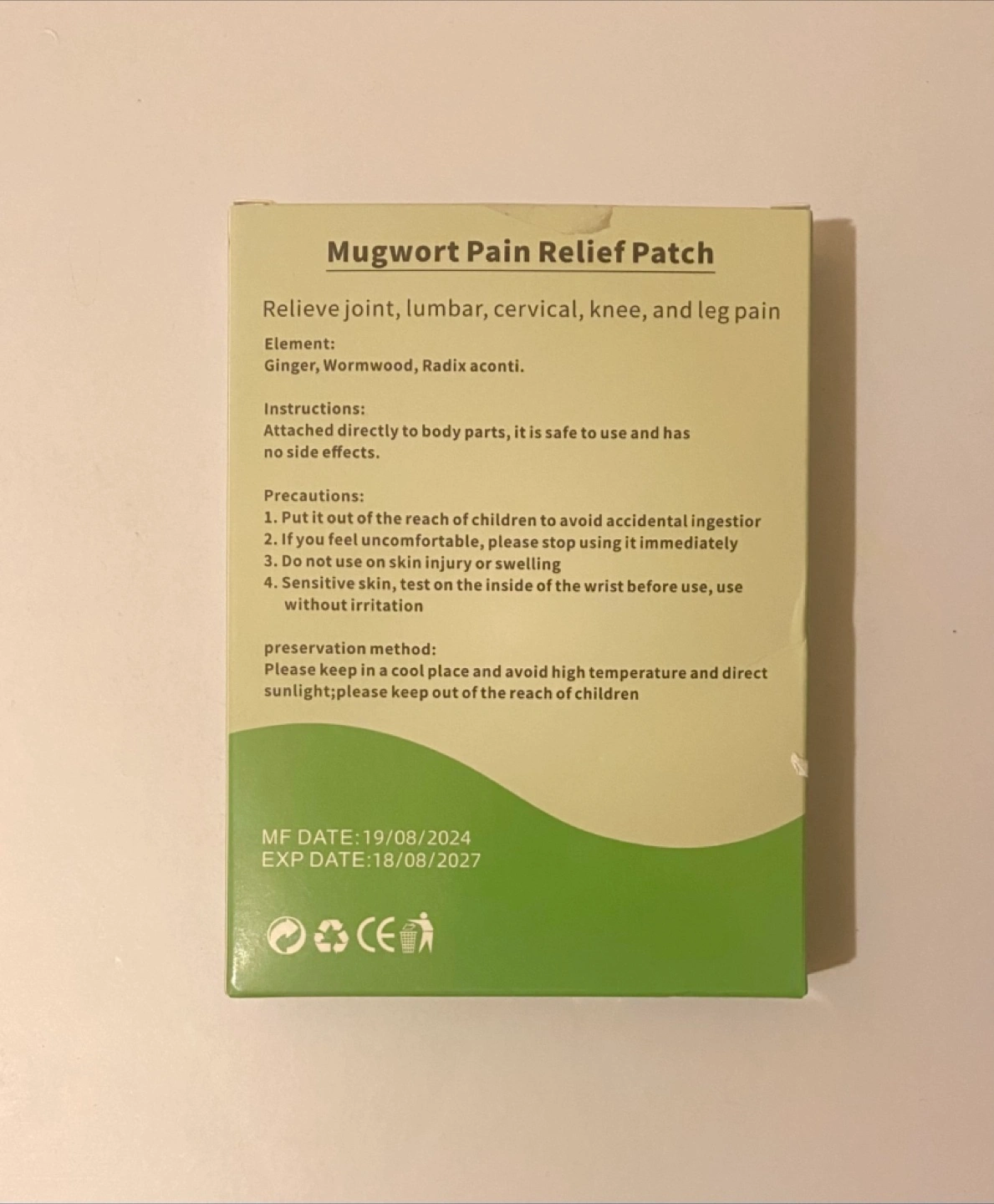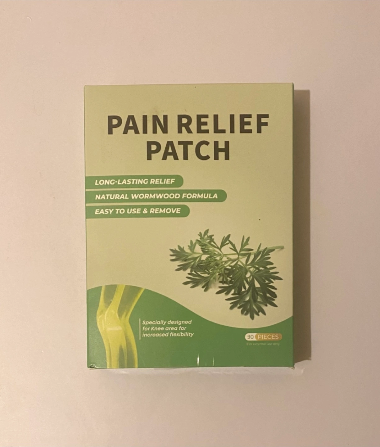 Long-lasting relief. Easy to use and remove. Specially designed for knee area for increased flexibility. Natural wormwood formula. For muscle and joint pain. Ginger, Wormwood, Radix Aconiti. Expiry date August 18. 2027 1 box for $5.00 2 boxes for $9.00