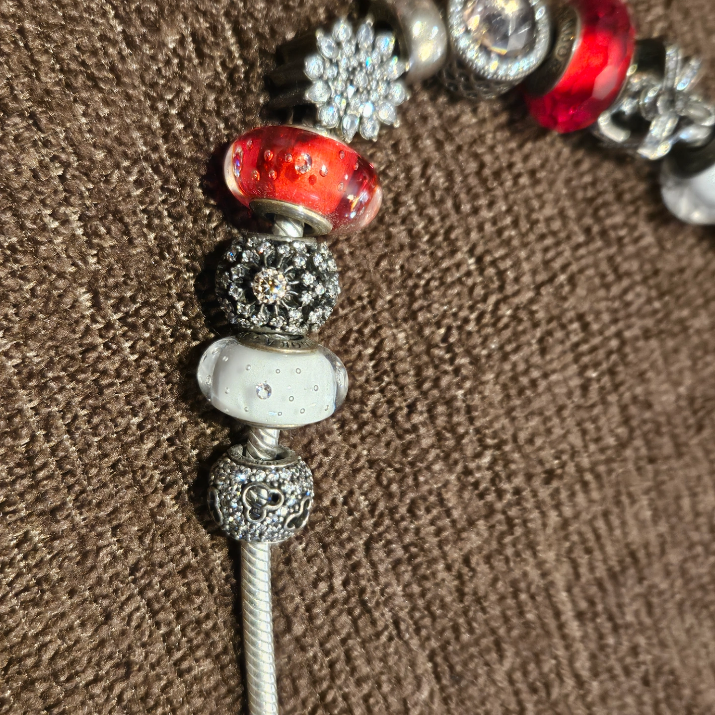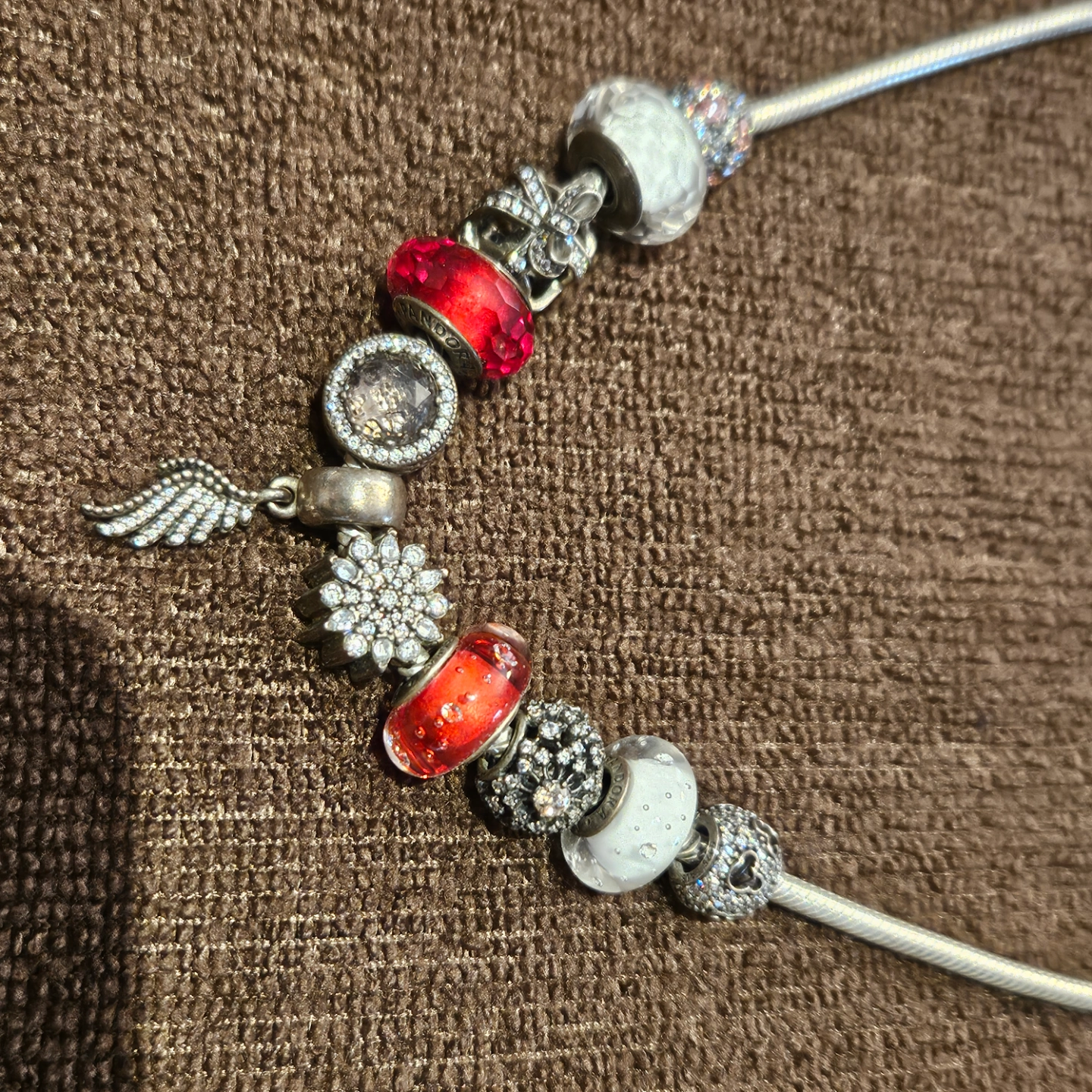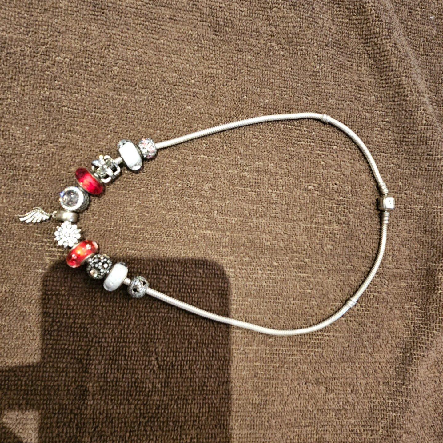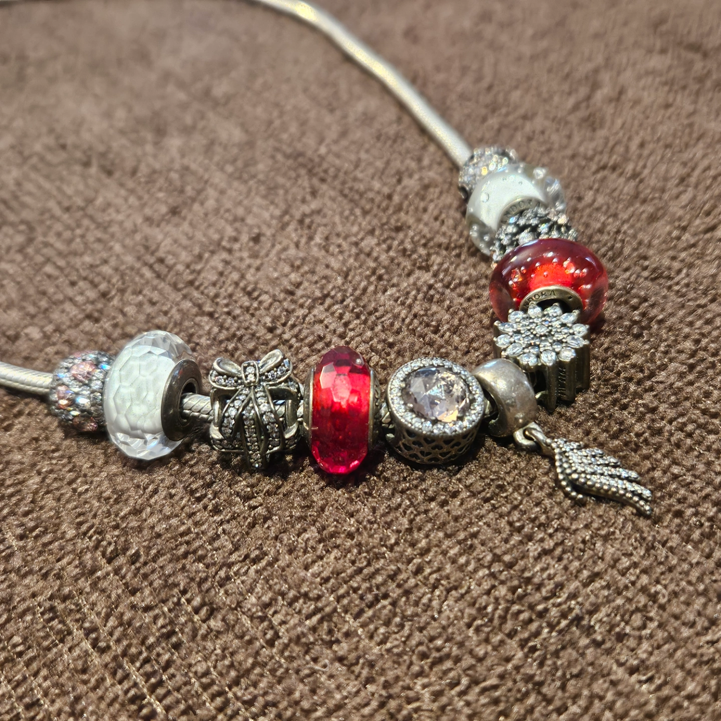 Silver necklace with several charms. Red and white glass beads. Silver snowflake and angel wing charms. Other decorative charms included. Snake chain style.