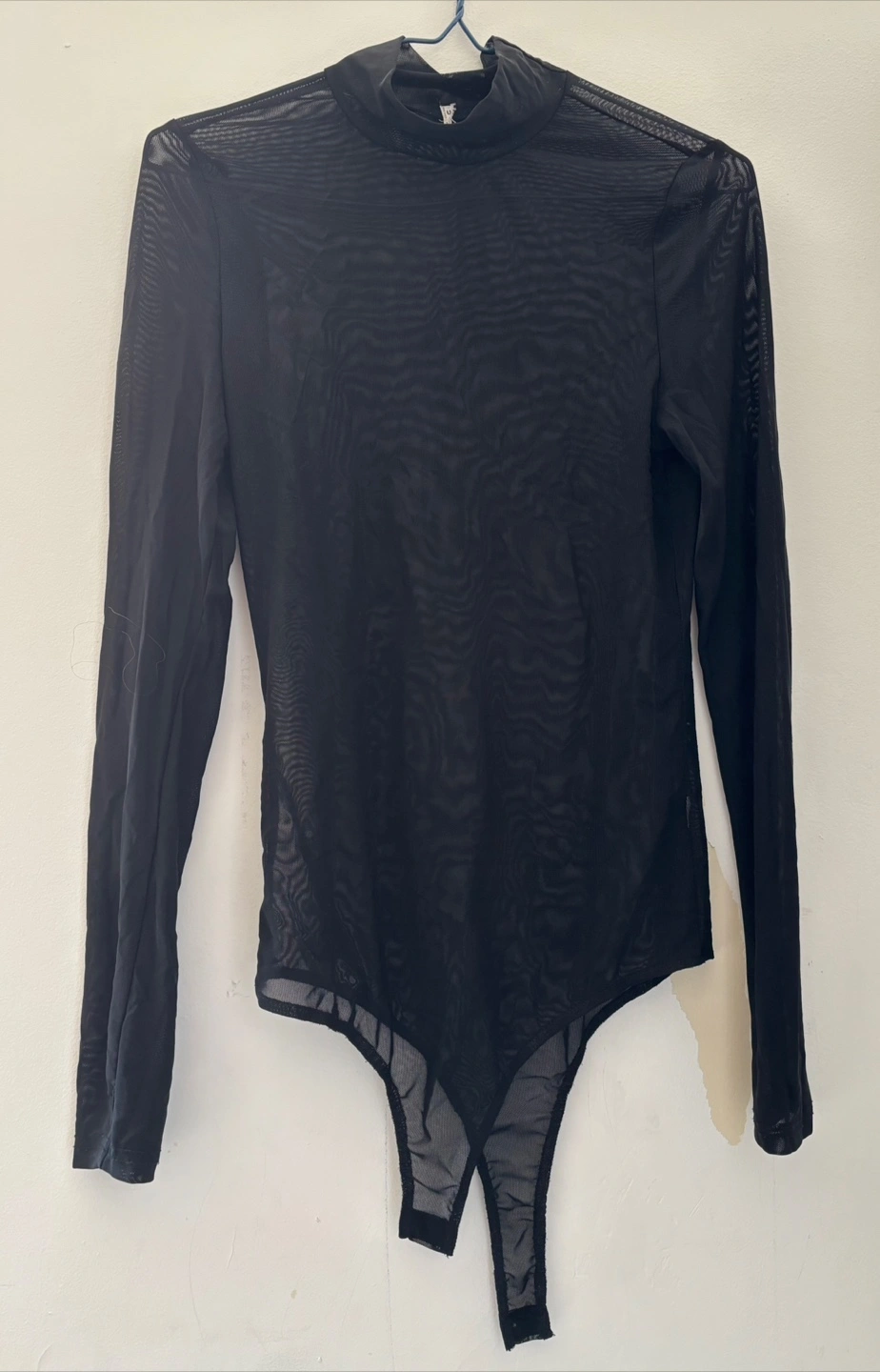 Long sleeve sheer mesh bodysuit. Mock neck. Snaps at the bottom.