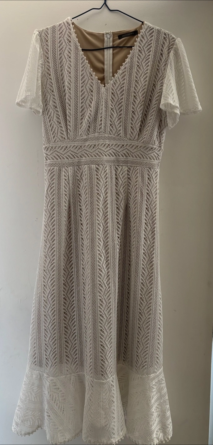 Off-white lace dress. V-neck. Short sleeves. A-line silhouette. Scalloped hem. Back zipper. Wear once only original price almost 100 with taxes